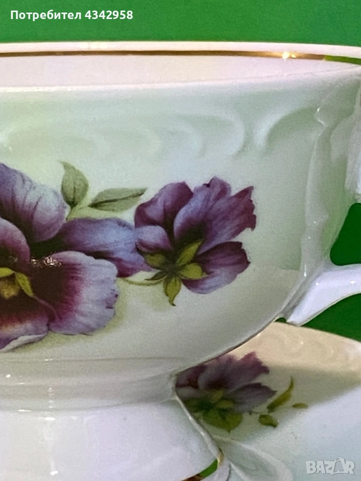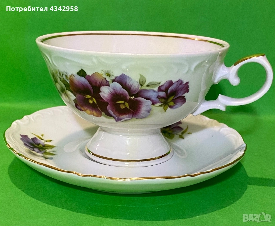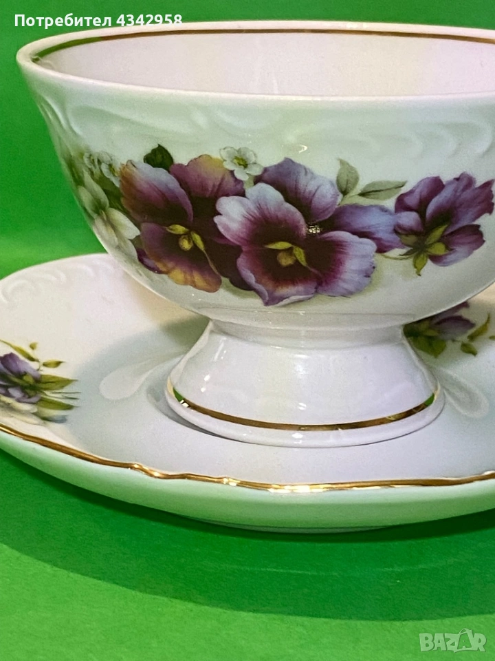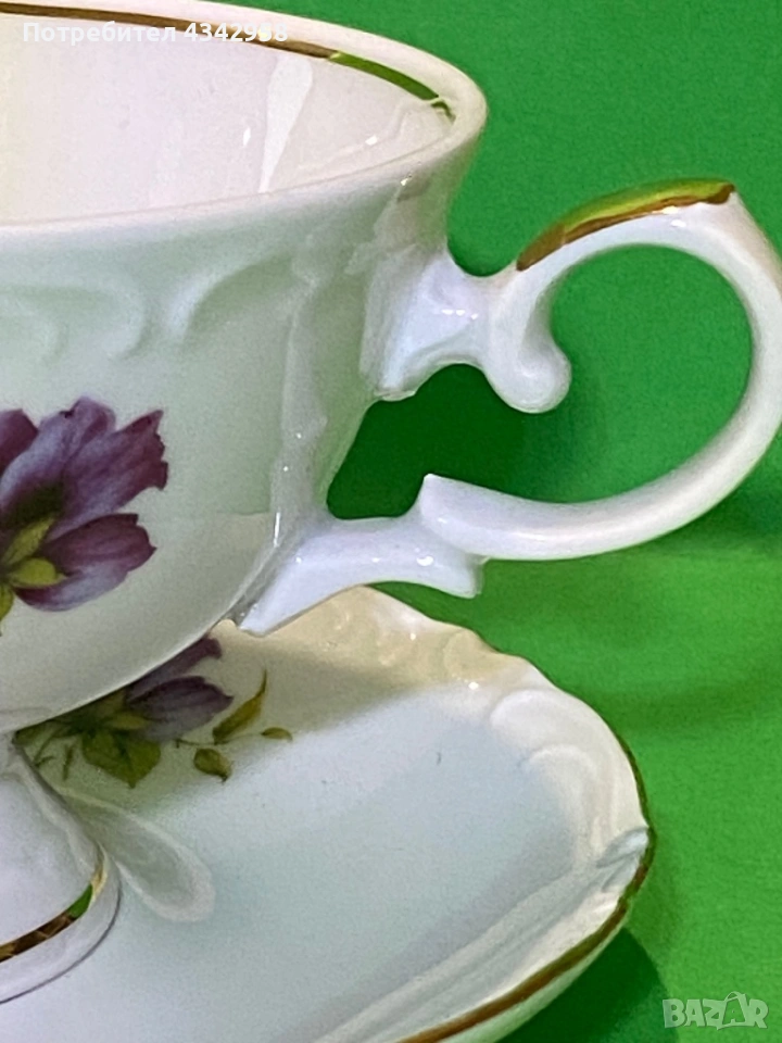 Винтидж порцеланова чаша с чинийка Vohenstrauss Johann Seltmann Bavaria Germany – теменужки, златен кант