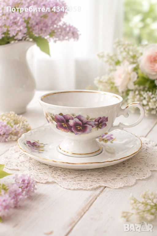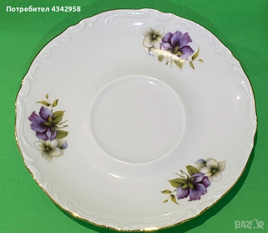 Фин бял порцелан с релефен борд, декориран с нежни лилави теменужки и златен кант – класически баварски стил.
