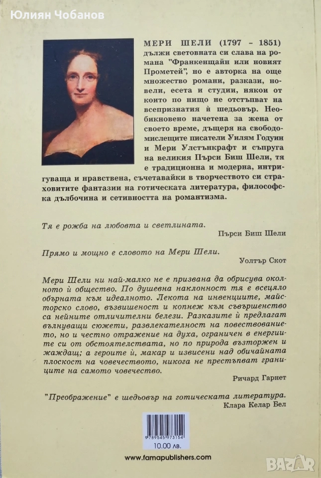 Мери Шели - Преображение МЕРИ ШЕЛИ (1797–1851) дължи световната си слава на романа "Франкенщайн или новият Прометей", но е авторка на още множество романи, разкази, новели, есета и студии, някои от които по нищо не отстъпват на всепризнатия й шедьовър. Необикновено начетена за жена от своето време, дъщеря на свободомислещите писатели Уилям Годуин и Мери Улстънкрафт и съпруга на великия Пърси Биш Шели, тя е традиционна и модерна, интригуваща и нравствена, съчетавайки в творчеството си страховитите фантазии на готическата литература, философска дълбочина и сетивността на романтизма. "Тя е рожба на любовта и светлината." Пърси Биш Шели "Прямо и мощно е словото на Мери Шели." Уолтър Скот "Мери Шели ни най-малко не е призвана да обрисува околното й общество. По душевна наклонност тя е всецяло обърната към идеалното. Лекота на инвенциите, майсторско слово, дълбока възвишеност и копнеж към съвършенство са нейните отличителни белези. Разказите й предлагат вълнуващи сюжети, развлекателност на повествованието, но и честно отражение на духа, ограничен в енергиите си от обстоятелствата, но по природа възторжен и жаждащ; а героите й, макар и извисени над обичайната плоскост на човечеството, никога не престъпват границите на самото човечество." Ричард Гарнет "Преображение" е шедьовър на готическата литература." Клара Келар Бел Цена: 5 евро
