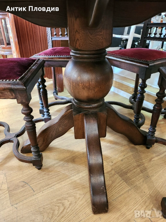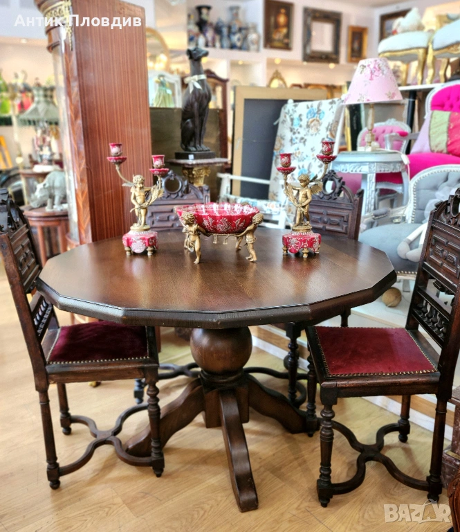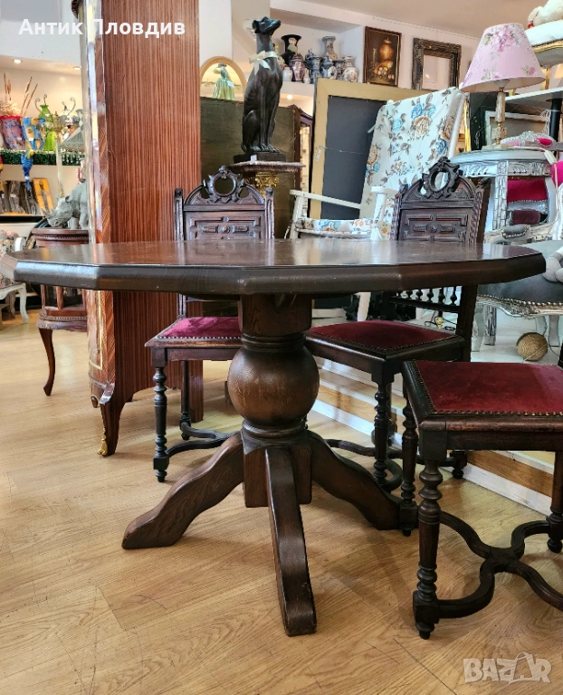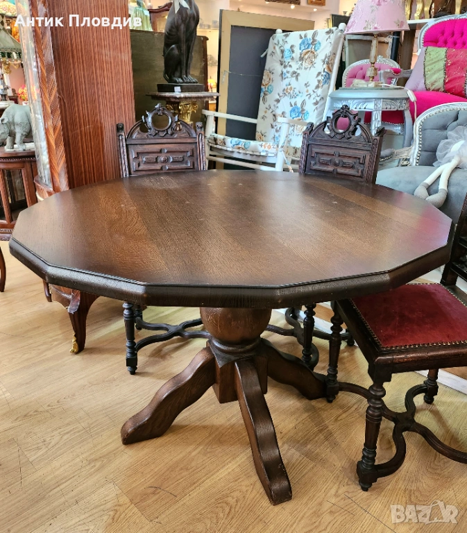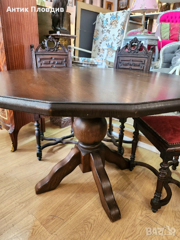 Елегантна винтидж трапезна маса, изработена от масивно дърво с богата текстура и тъмна патина. Отличава се с 16-ъгълен плот и централно краче с декоративна основа, което ѝ придава стабилност и визуален характер. Идеален избор за интериори в класически или еклектичен стил, където се цени автентичната изработка и благородният чар на старинната мебел.