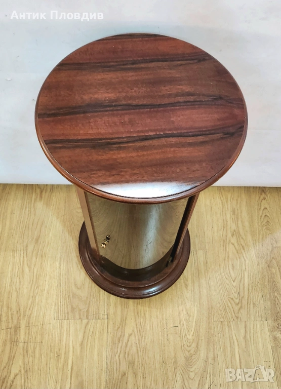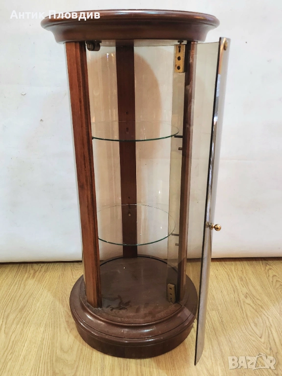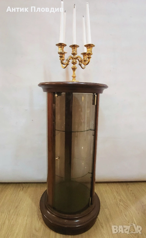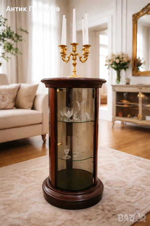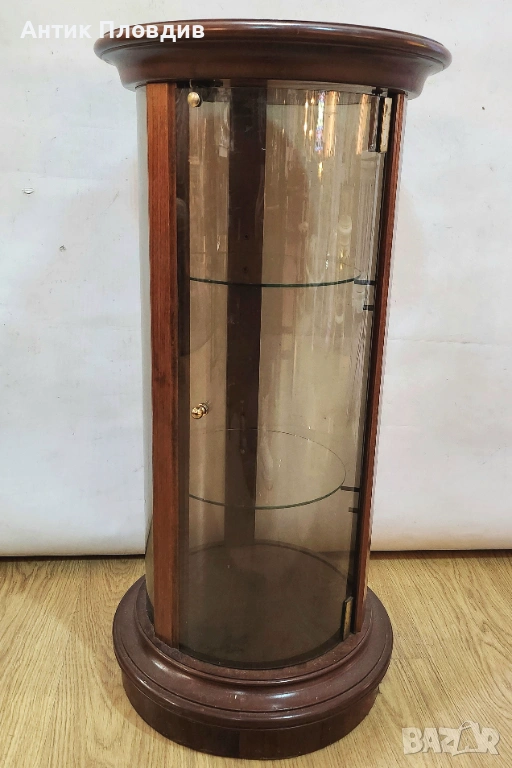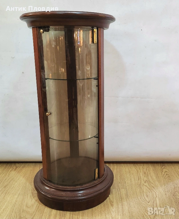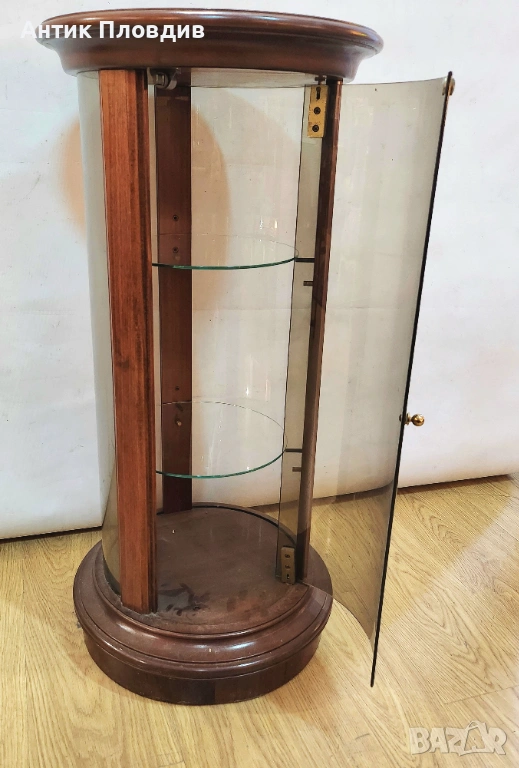 Елегантна цилиндрична витрина с корпус от масивно дърво и извито стъкло, създадена за стилно представяне на декоративни предмети, порцелан или колекционерски вещи. Компактната форма я прави подходяща както за класически интериори, така и като акцент в по-съвременна среда. Витрината е стабилна, с изчистени пропорции и дискретен чар, който не доминира, а допълва пространството.