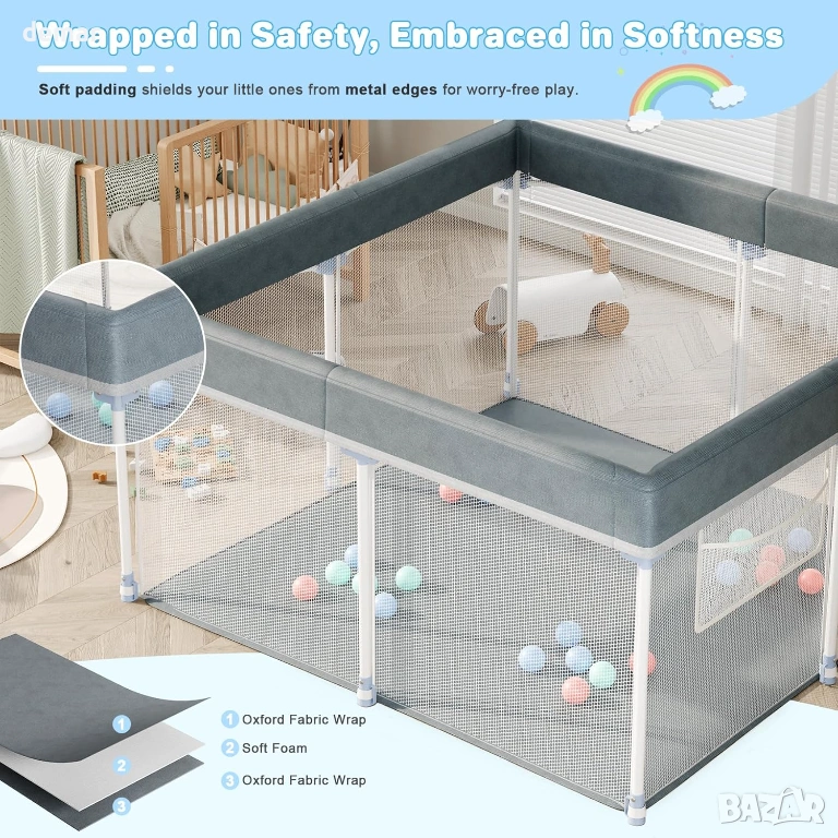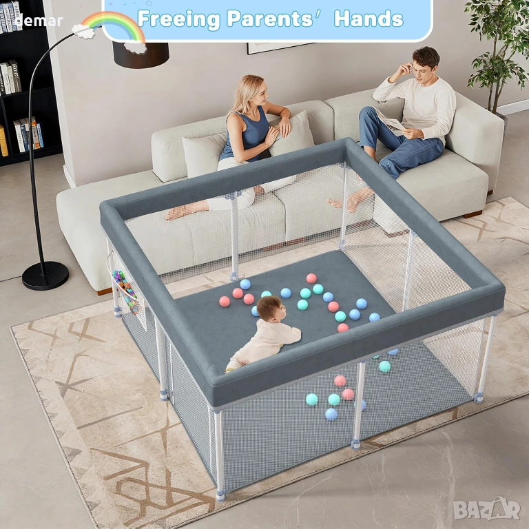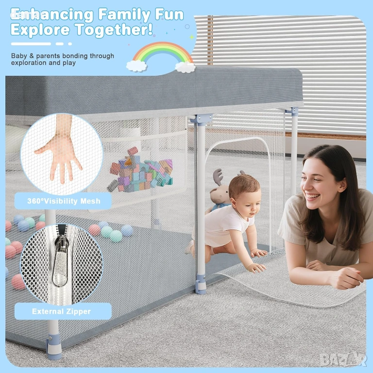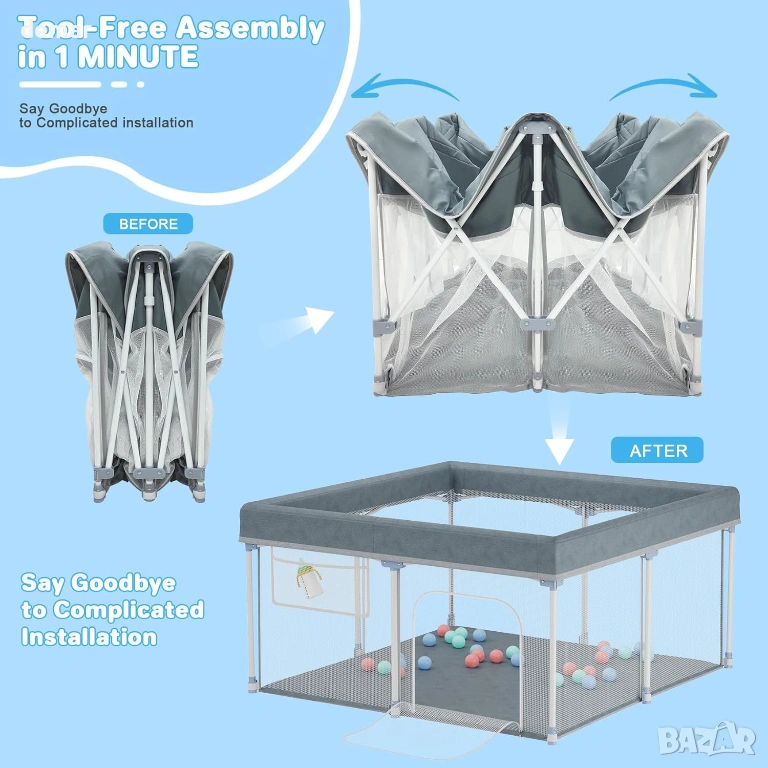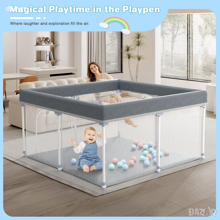 Тази сгъваема площадка за игра е проектирана да пести място и да е лесна за пътуване, предлагайки просторна и сигурна среда, където бебетата могат да пълзят, играят и да развиват двигателни умения. Изработена от безопасни, нетоксични и издръжливи материали, тя е с дишащи мрежести страни за ясна видимост и въздушен поток, осигурявайки комфорт и безопасност по всяко време, а бързото сглобяване без инструменти и лесното почистване я правят практична за ежедневна употреба.
