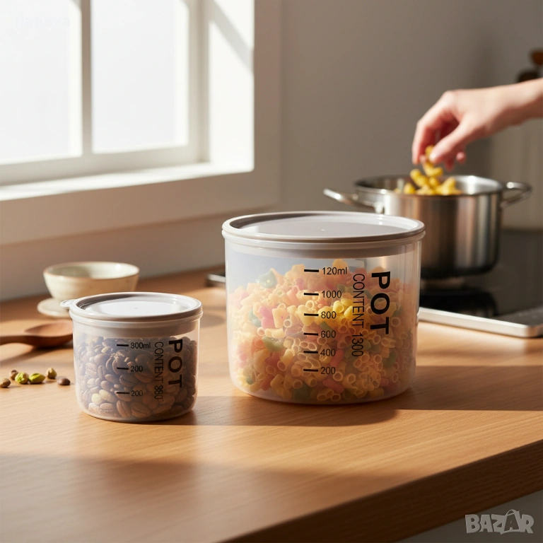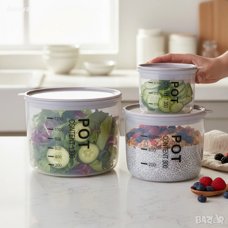 Прозрачният дизайн позволява бързо да виждате съдържанието, без да отваряте кутиите, а ясно обозначената скала помага за ориентир според маркировката на производителя. Контейнерите са подходящи за съхранение на сухи храни, готови продукти, салати, паста, ядки, зърнени закуски и други храни за ежедневна употреба. Изчистеният външен вид ги прави подходящи както за шкафове, така и за хладилник или кухненски плот.