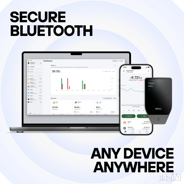 Trezor Safe 7 - хардуерен крипто портфейл с Bluetooth, сензорен екран