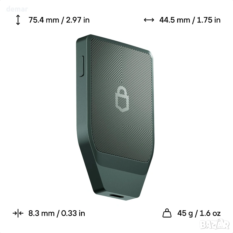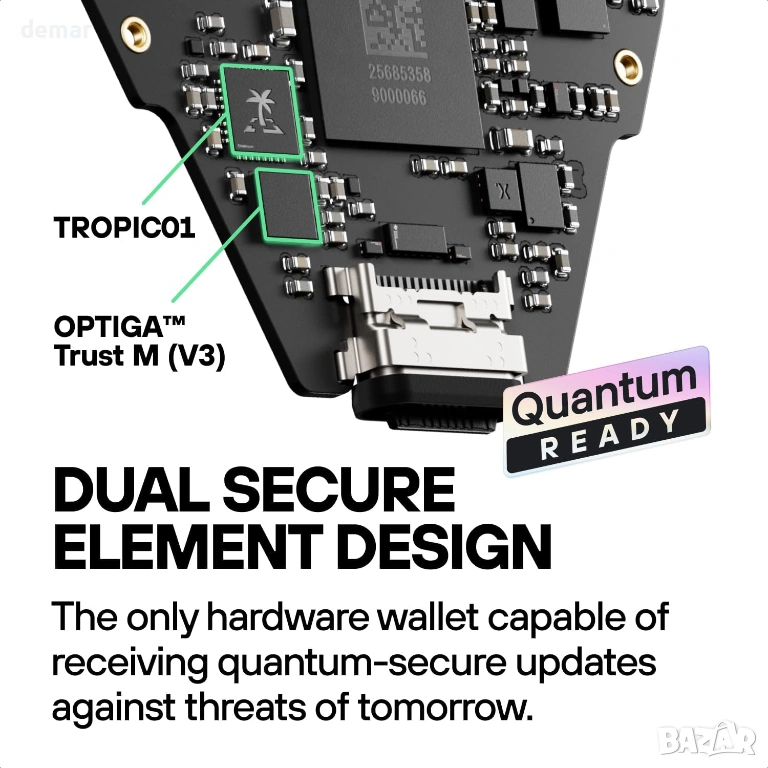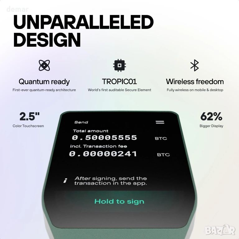 Усъвършенстваната двучипова сигурност, комбинираща отворен, напълно одитиран чип TROPIC01 с EAL6+ защитен елемент, осигурява силна защита срещу физически атаки, докато квантово-готовата архитектура подготвя за бъдещи заплахи. Голям цветен сензорен екран с висока резолюция позволява ясен преглед на транзакциите и управление на активите, допълнен от криптирана Bluetooth свързаност и Qi2 безжично зареждане за употреба без кабел. Портфейлът се свързва чрез Bluetooth или USB-C с Android, iOS и настолен компютър чрез придружаващото приложение и разполага с първокласен анодизиран алуминиев корпус с подсилено стъкло, издръжлива LiFePO₄ батерия и IP67 устойчивост на прах и вода.