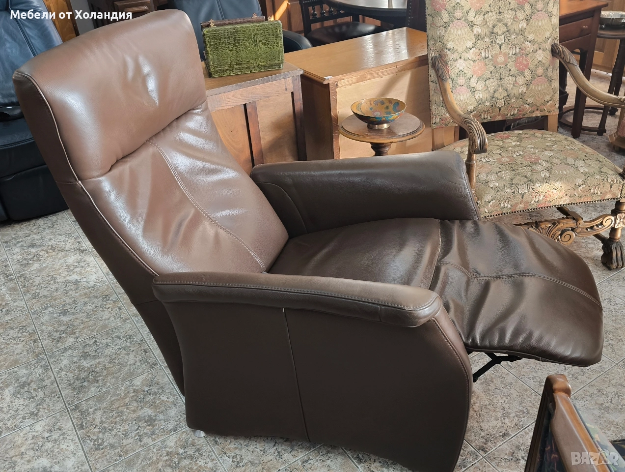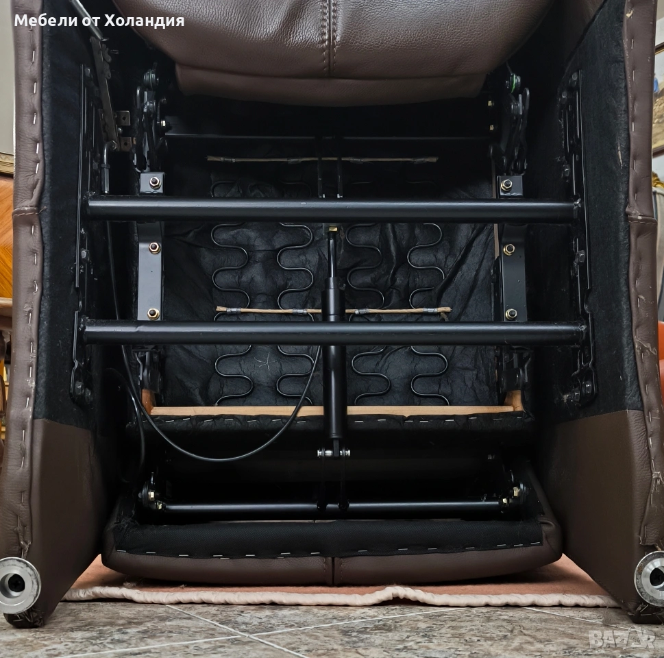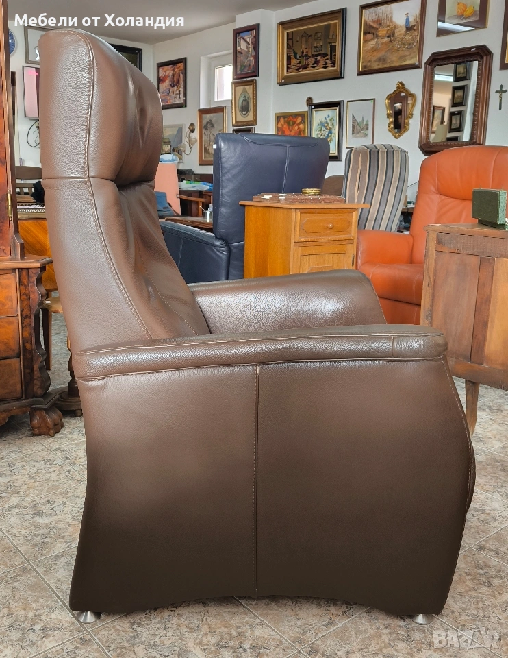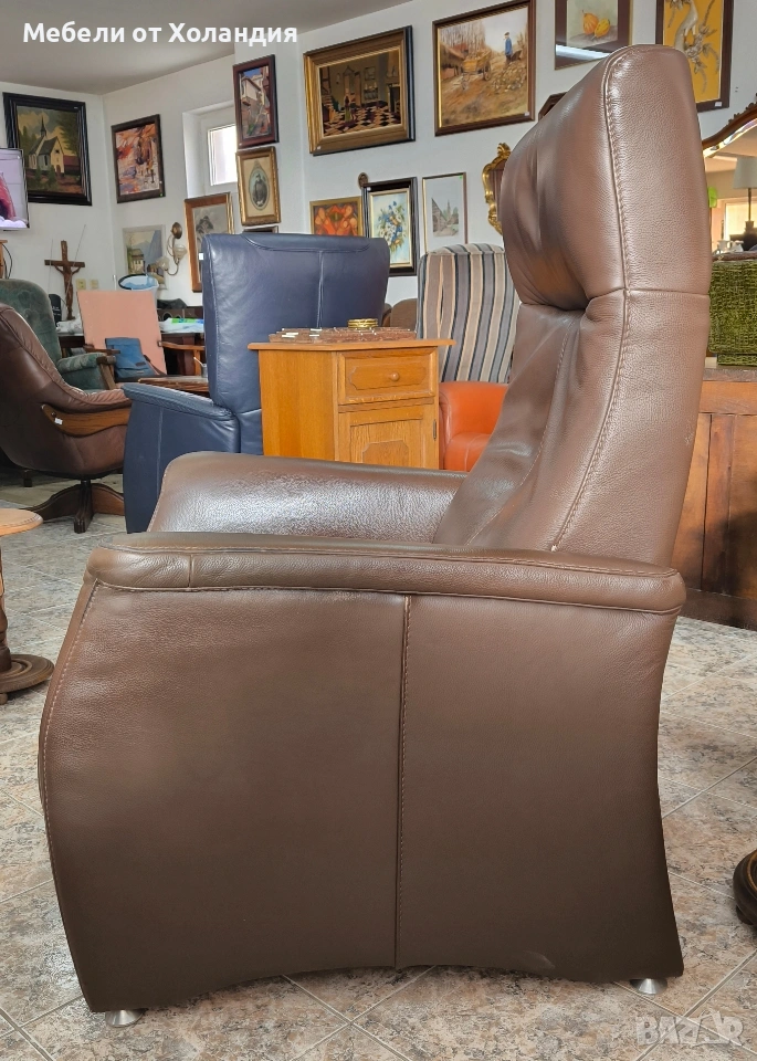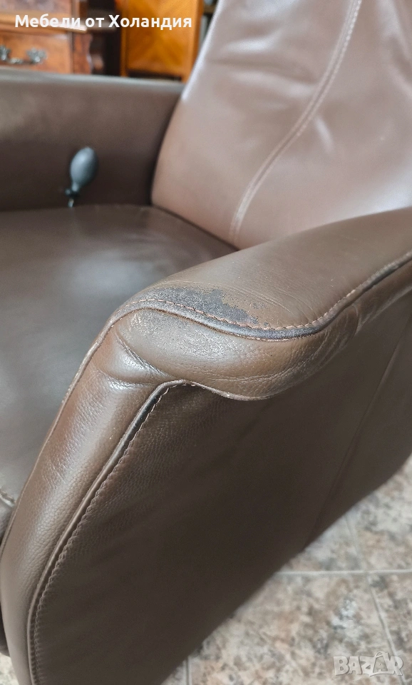 Голямо механично релакс кресло от естествена кожа. Отлична работа на механизмът; здрава ествена кожа; помпичка за втвърдяване на ломбалната опора; излющена боя по ръба на левия подлакътник, видна на снимките.