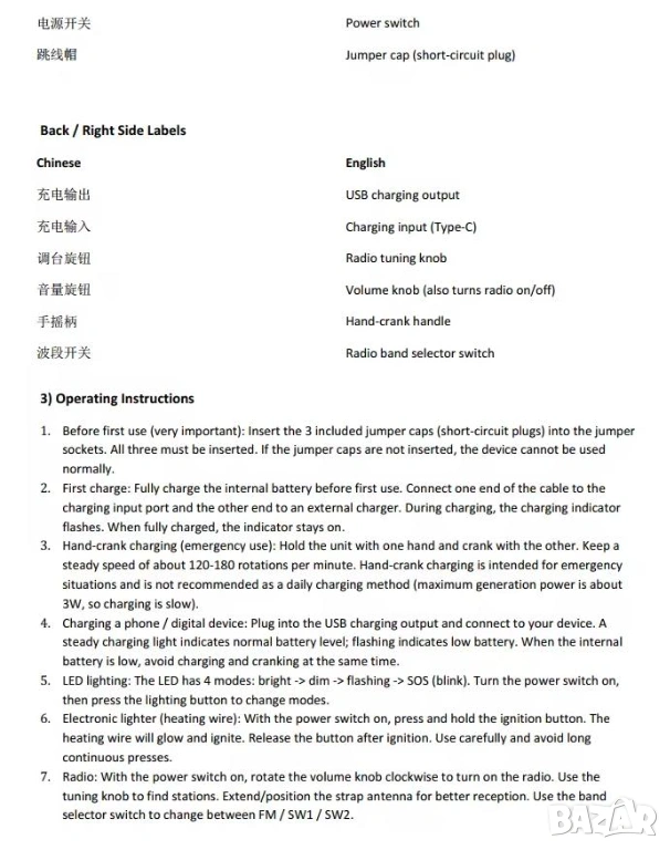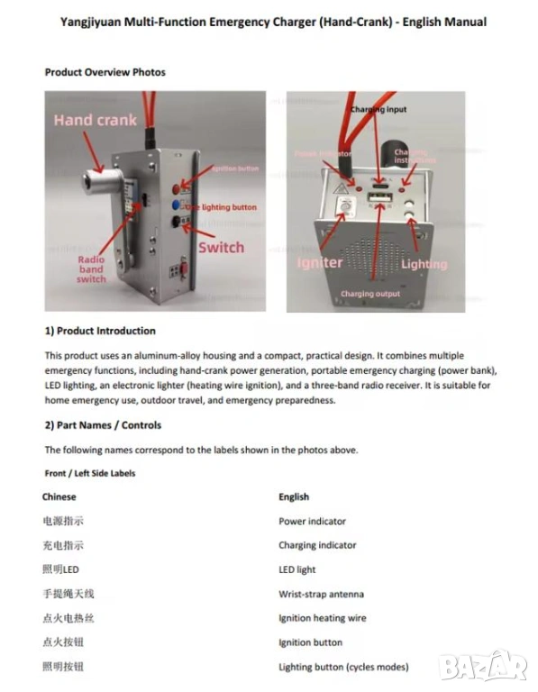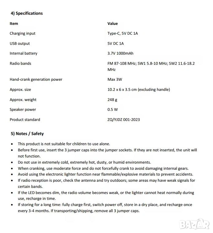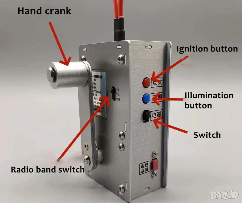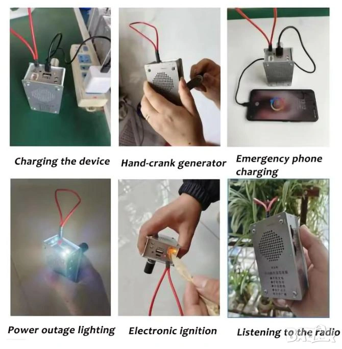 * Устройството е ръчно задвижван генератор с радио и запалка.