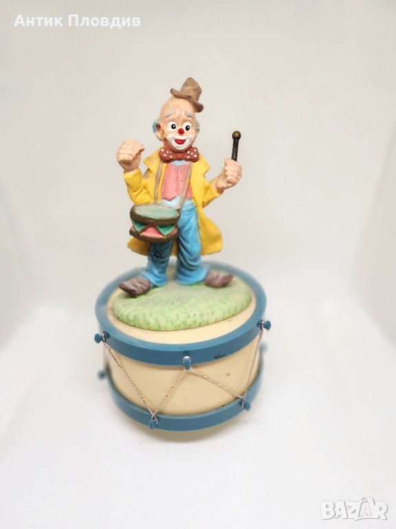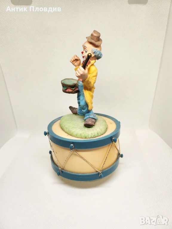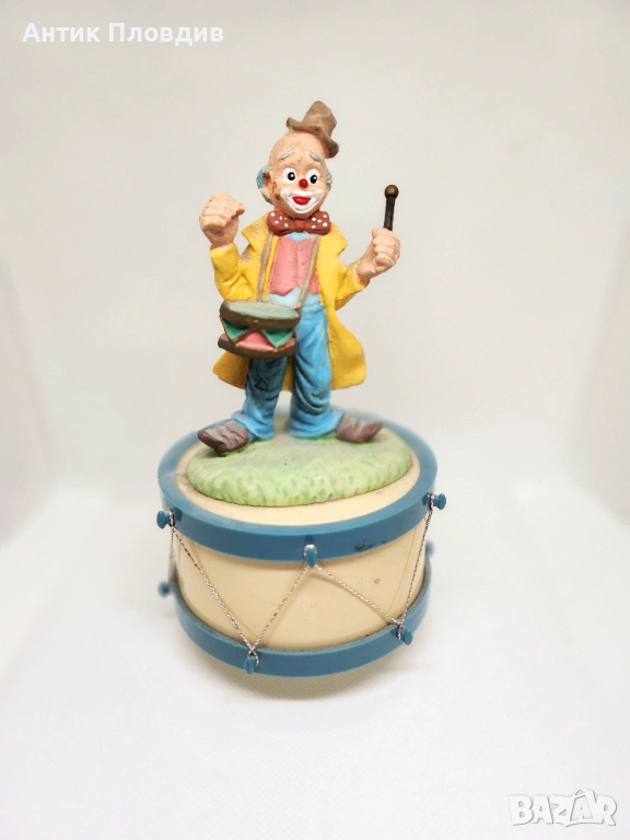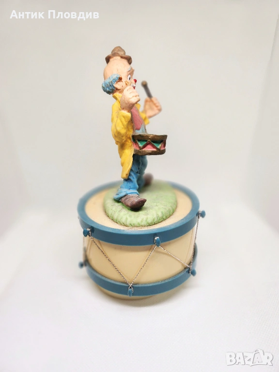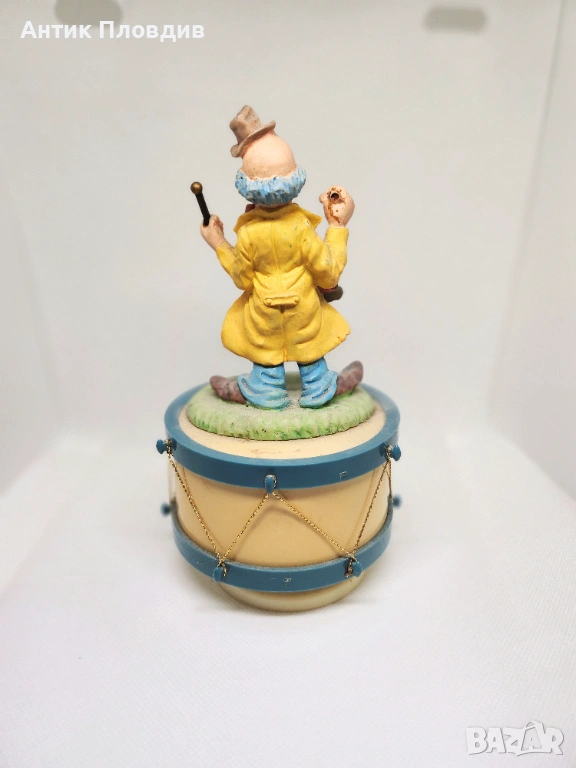 Керамичен музикален карусел с вграден механизъм – навива се и свири. Фигурката на клоун с барабан е изпълнена в живи, но меки цветове и носи леко ретро, игриво излъчване. Подходящ декоративен акцент за витрина, детска стая или колекция от музикални фигурки.