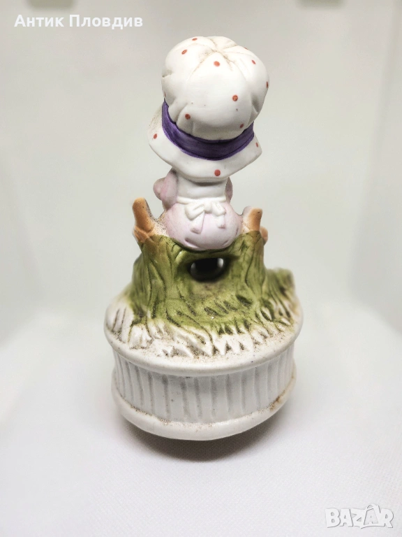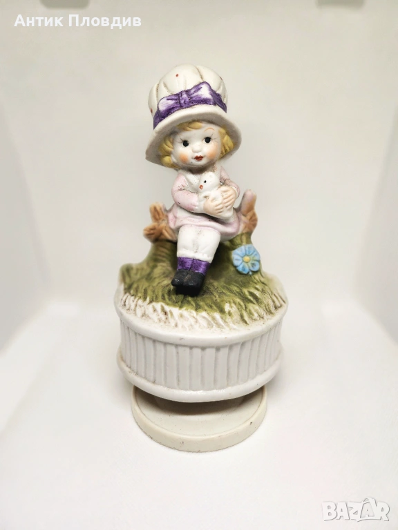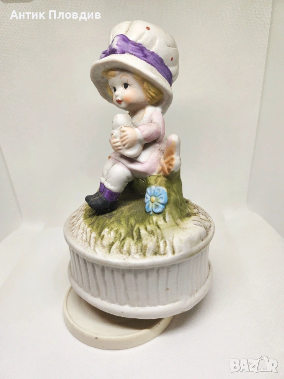 Нежен керамичен музикален карусел с механика – навива се и свири. Фигурката на момиченце с коте е изработена в меки пастелни тонове и носи спокойно, детско излъчване с леко носталгичен характер. Подходящ за витрина, детска стая или като сантиментален декоративен акцент.