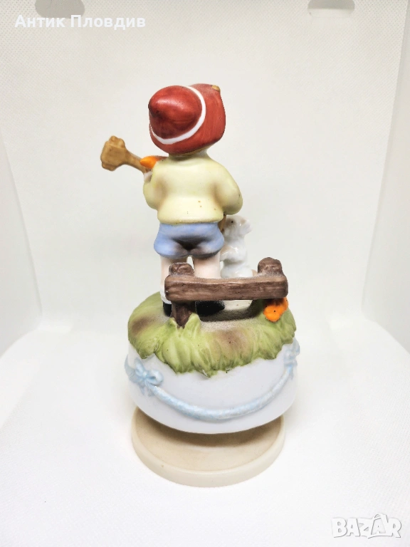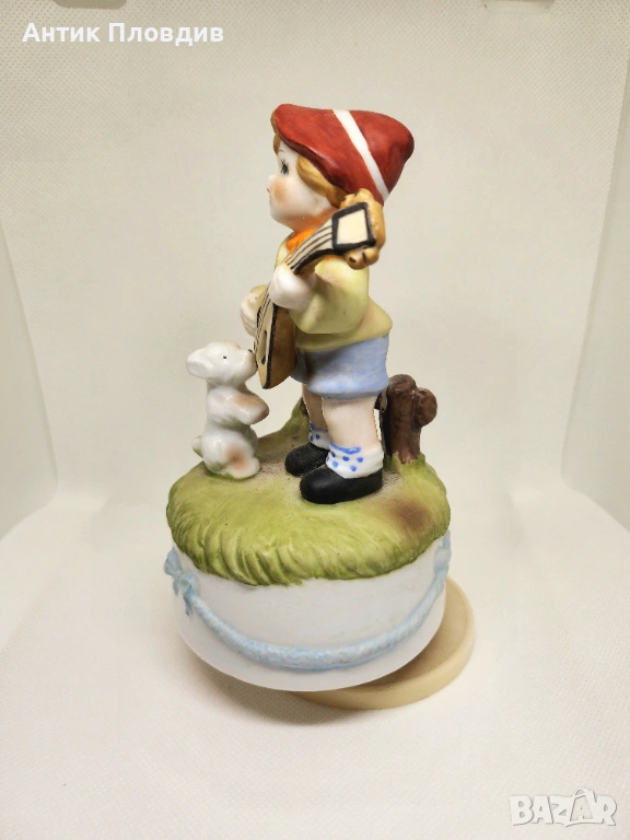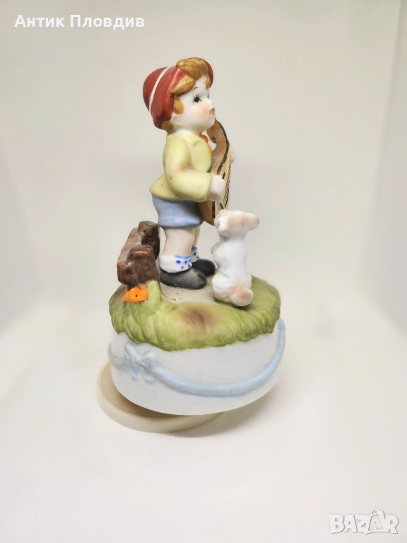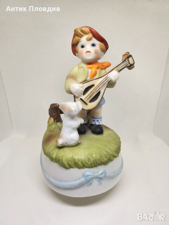 Очарователна керамична фигурка с вграден механичен музикален механизъм – навива се и свири. Сцената с момче, мандолина и малко куче е изпълнена в меки цветове и фино моделирани детайли, които придават приказно и спокойно излъчване. Подходяща за витрина, детска стая или като носталгичен декоративен акцент.