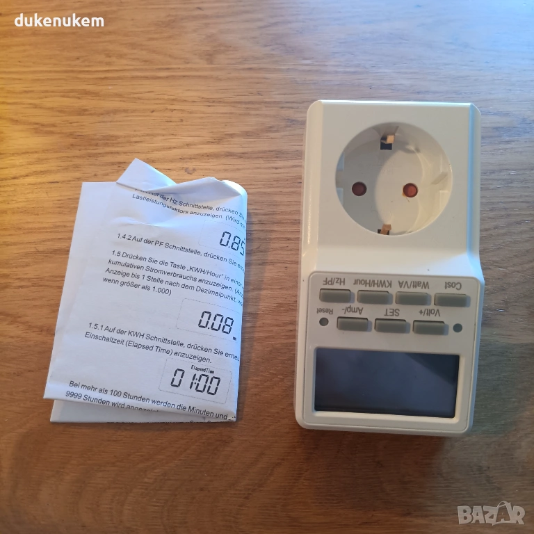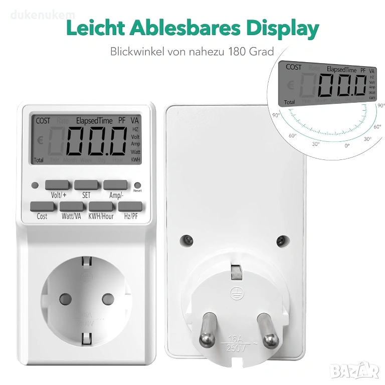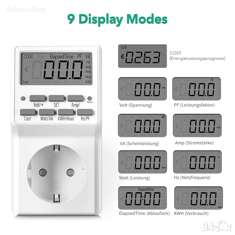 9 режима за прецизно измерване – показва V (волтове), A (ампери), W (ватове), VA (привидна мощност), Hz, PF (фактор на мощността)