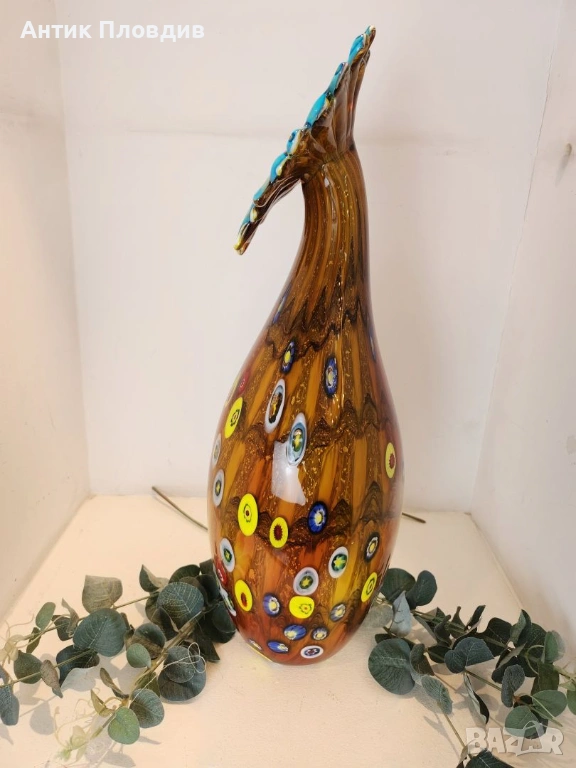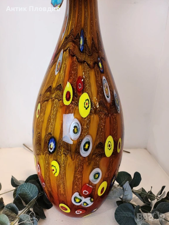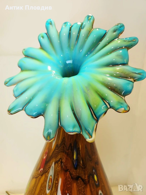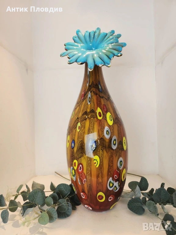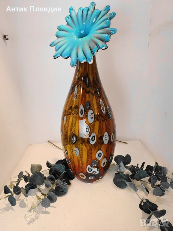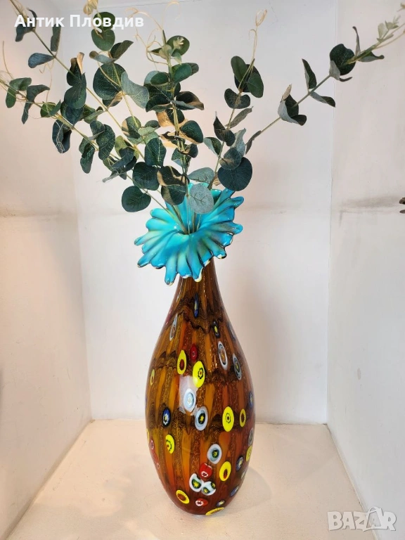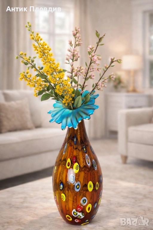 Ефектна ваза от ръчно изработено художествено стъкло, изпълнена в техниката милефиори – с цветни включвания, вплетени в топъл кехлибарен корпус и завършени с изразителен тюркоазен кант. Формата е издължена и балансирана, а стъклото улавя светлината по мек и естествен начин. Подходяща за живи цветя или клонки и за интериори със скандинавско, светло и изчистено звучене.