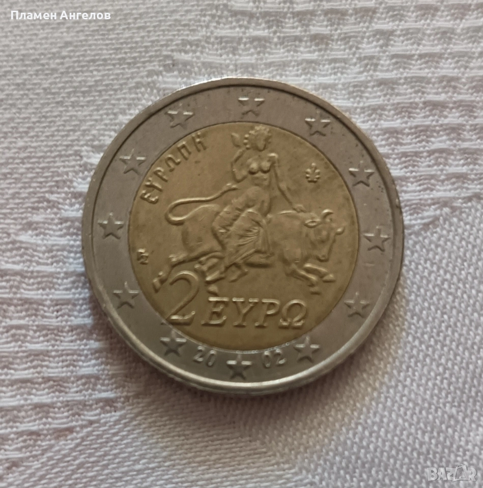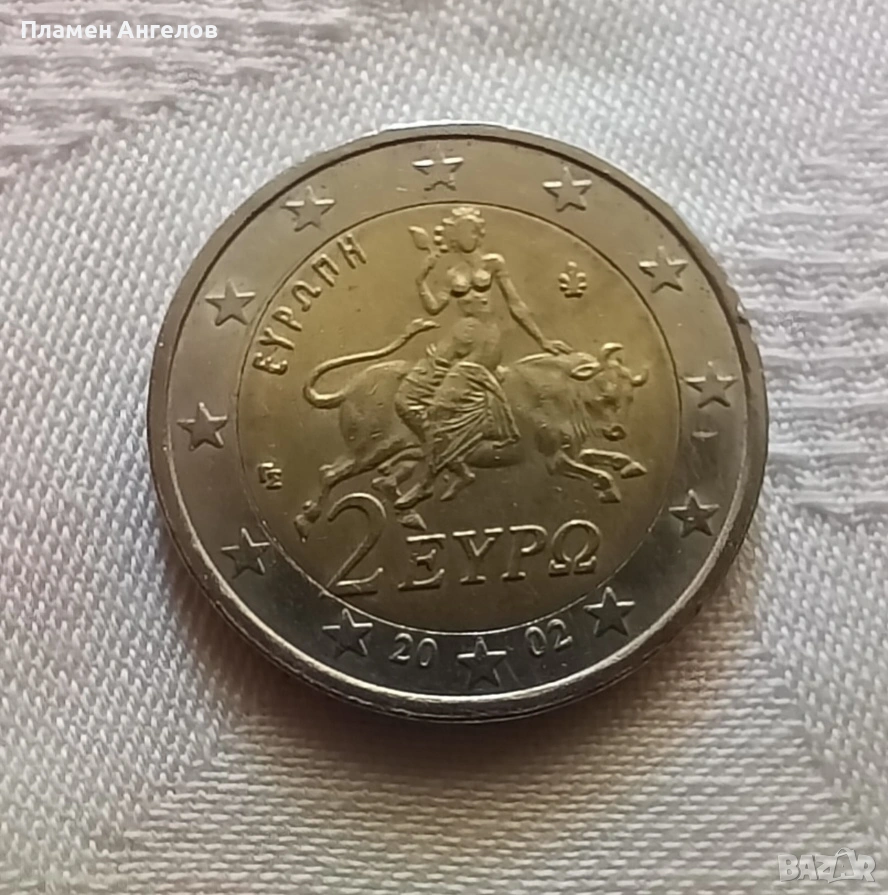 Монета от 2 Евро Гърция 2002година. Зевс и Европа. Монетата е в много добро състояние.