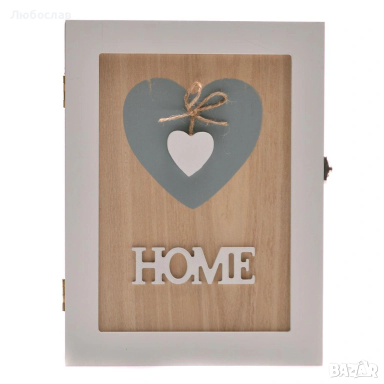 Красива и практична дървена кутия за ключове с вратичка, декорирана с нежни сърца и надпис Home – идеално допълнение към уютния дом.