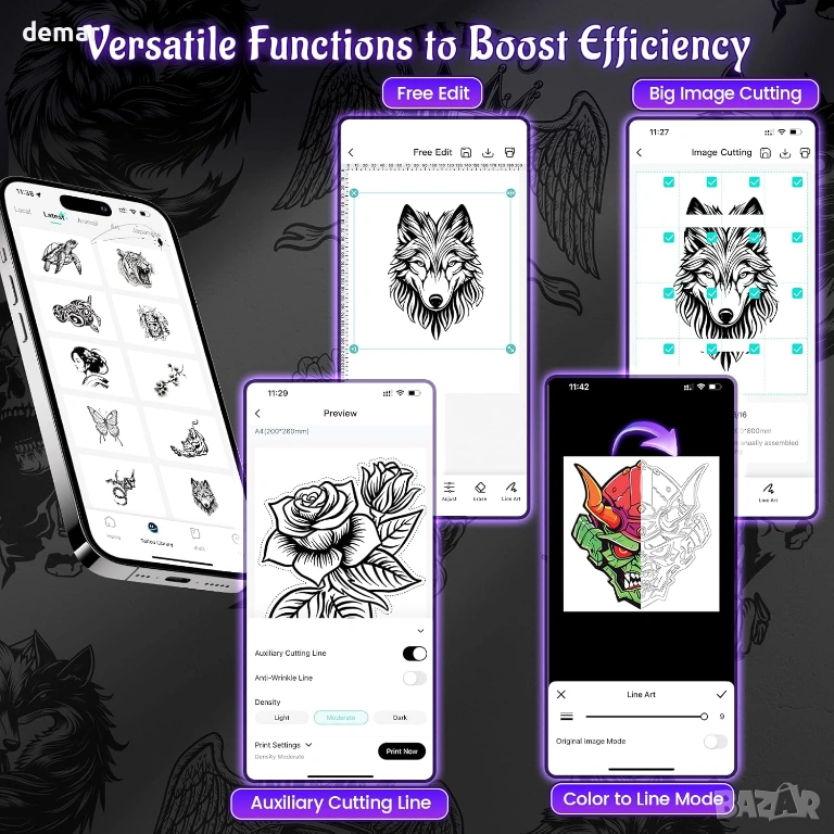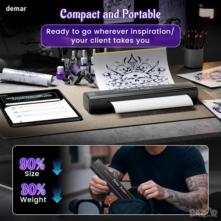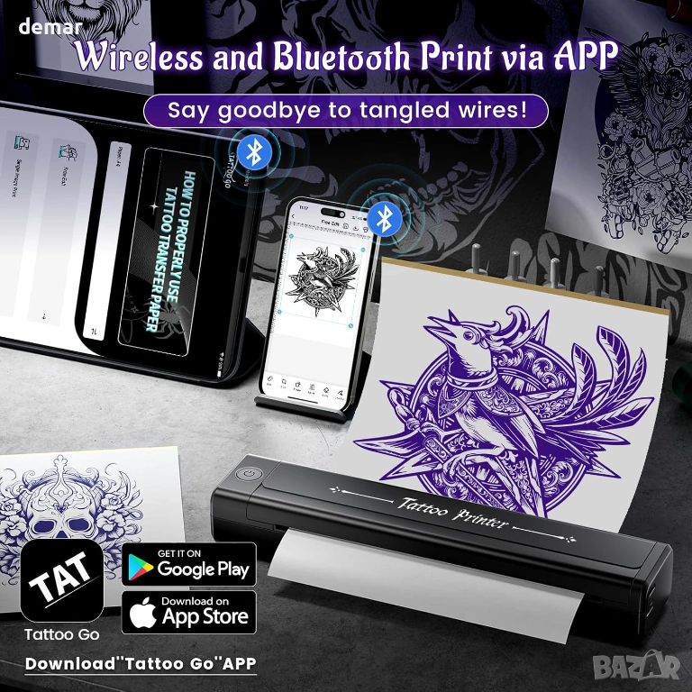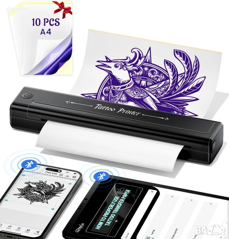 принтер за шаблони за татуировки е проектиран за лесна преносимост и минимално използване на работното пространство, което го прави подходящ за студия или мобилни конфигурации. Той осигурява прецизни, без гънки трансфери на шаблони, дори за детайлни дизайни, намалявайки грешките и спестявайки време за подготовка. Устройството поддържа Bluetooth печат от смартфони и таблети чрез специално приложение, както и USB връзки за компютри с множество операционни системи. Подобрената батерия с висок капацитет позволява дълго време на работа и печат на шаблони с голям обем с едно зареждане. Простите контроли и интуитивното приложение позволяват бързо преоразмеряване и точни трансфери, което го прави практичен както за начинаещи, така и за опитни татуисти веднага след разопаковането.