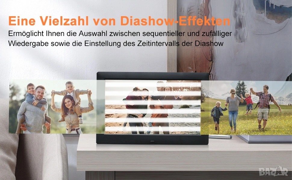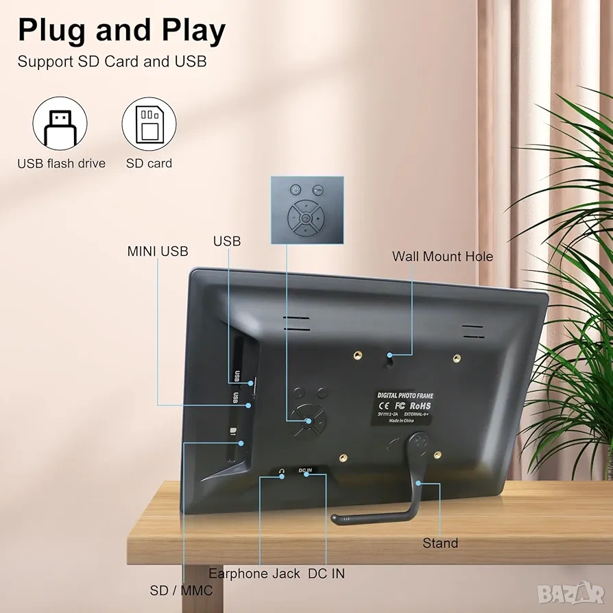 * Plug & Play функционалност: Устройството стартира автоматично слайдшоу при поставяне на USB флаш памет или SD карта. Не се изисква Wi-Fi връзка или инсталация на приложения.