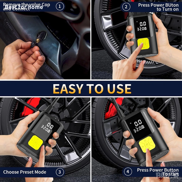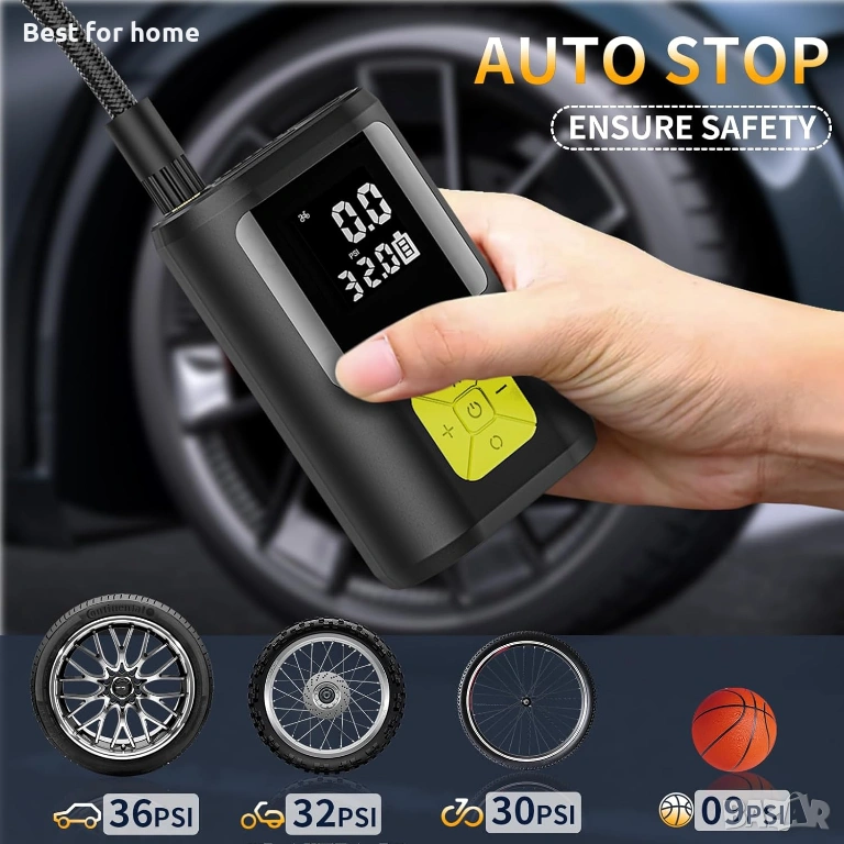 150 PSI, обезболяваща производителност: Преносимата електронна въздушна помпа EVARYOO осигурява максимално налягане от 150 PSI и въздушен поток от 32 л/мин. Тя може да напомпа напълно автомобилни гуми за 9 минути, мотоциклетни гуми за 3 минути, велосипедни гуми за 90 секунди и различни топки за 50 секунди. Трябва само да превключите на подходящия режим на напомпване и след като напомпването приключи, тя автоматично спира, за да предотврати пренапомпване.