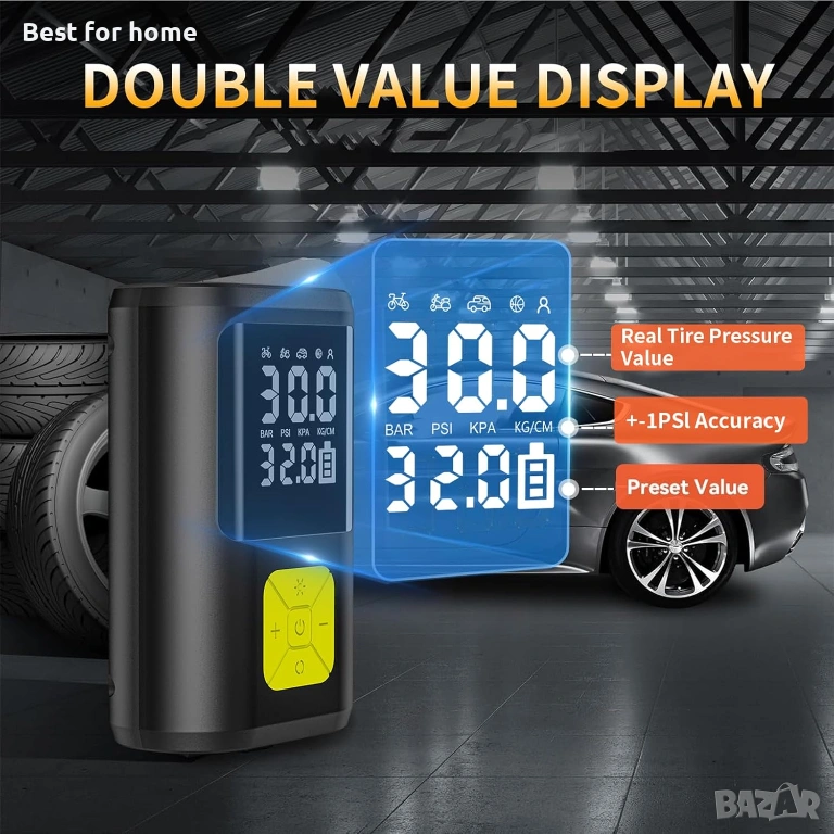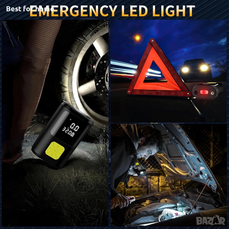 LCD екран и LED фенерче: Електрическата помпа за гуми има голям LCD екран с дигитален дисплей, който е по-ясен и ярък и не само може да напомпва колата ви, но и да зарежда мобилния ви телефон и да действа като фенерче. Фенерчето има и три режима на аварийно осветление (осветление, стробоскоп, SOS) на електрическата помпа за велосипед, подходящи за спешни случаи на пътя и през нощта.