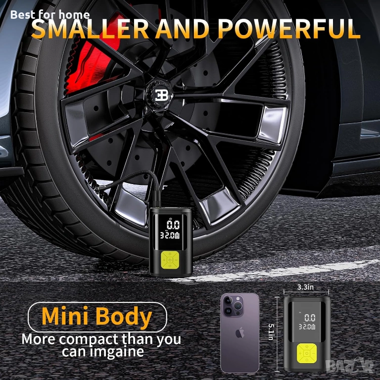 Ултралека: Електрическата велосипедна въздушна помпа е оборудвана с високопрецизен алуминиев цилиндър, който позволява бързо напомпване на гумите. Максималното налягане на напомпване е 150 psi / 10,3 бара, не е необходимо отнемащо време ръчно напомпване. С тегло от само 450 г (размери: 13,5 x 4,6 x 9 см), тя е толкова компактна и лека с минималистичен дизайн, че лесно се побира в чантата, стойката за велосипед, раницата и колата ви, създадена за вашето пътуване.