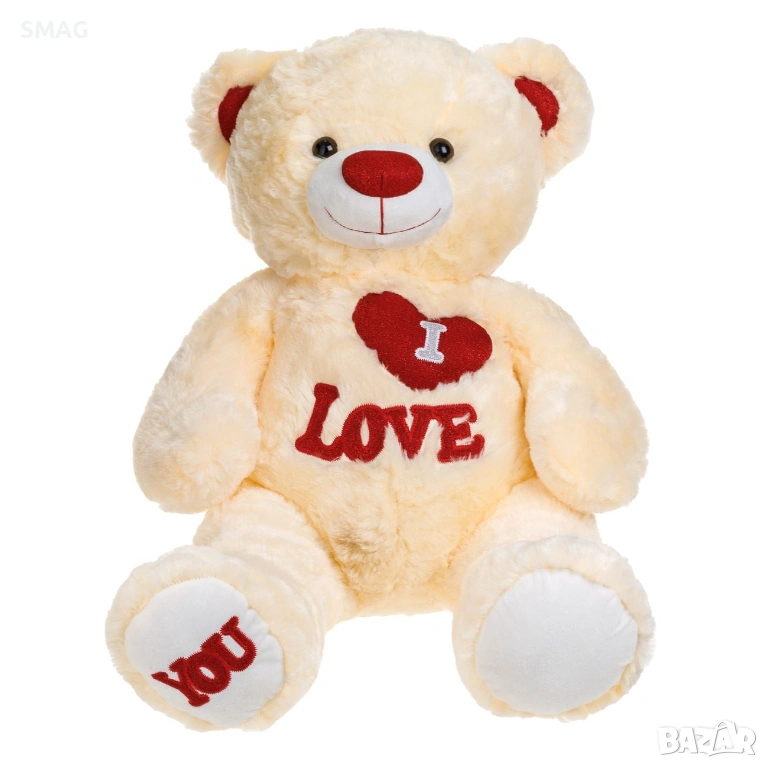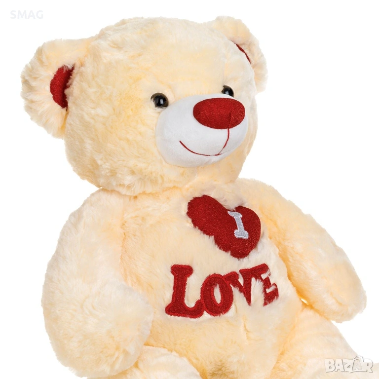 Голямо и изключително меко плюшено мече в светлобежов цвят с червени блестящи детайли на ушичките и нослето. Декорирано с червено сърце и бродиран надпис „I Love You“, което го превръща в перфектен подарък за изразяване на обич и внимание.