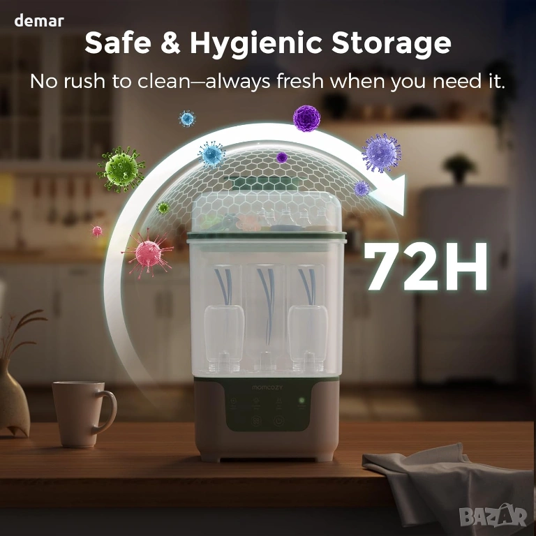 стерилизатор е проектиран да пести място на плота, като същевременно побира до шест шишета плюс малки бебешки принадлежности, предлагайки бърза пълна стерилизация с пара само за осем минути, за да елиминира 99,9% от често срещаните бактерии. Той съхранява предметите безопасно до 72 часа, разполага с дизайн, който може да се подрежда, удобен за пътуване, и включва отделна решетка за сушене, която помага за поддържането на организирана зона за хранене. С мощна функция за бързо сушене, която изсушава шишетата и аксесоарите за по-малко от 30 минути, той комбинира стерилизиране, сушене, съхранение и автоматична работа в една проста, напълно автоматична система, пригодена за заети нови родители.