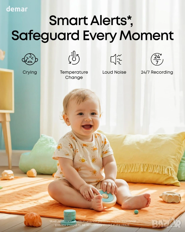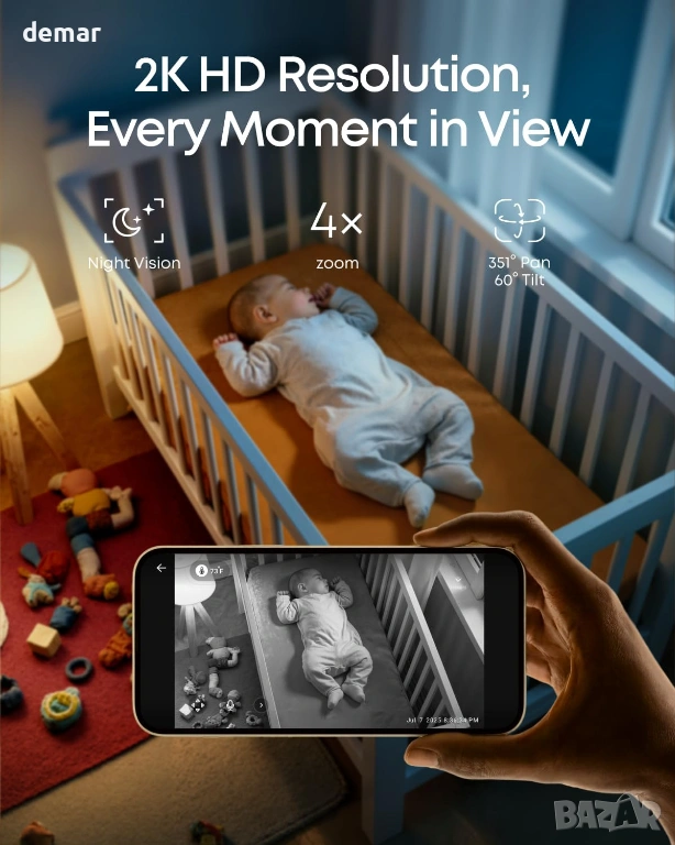 Предоставя ясно 2K видео с широкоъгълно панорамиране, накланяне, мащабиране и разделен екран за едновременно наблюдение на две деца, денем или нощем. Поддържа хибридно наблюдение със стабилна локална връзка без Wi-Fi и опционален отдалечен достъп, което позволява сигурно споделяне с множество членове на семейството. Захранван от дълготрайна батерия за продължителна употреба през нощта, той осигурява непрекъснато наблюдение без често зареждане. Интелигентното разпознаване проследява движение, плач, температура и необичайни звуци, с персонализируеми известия за намаляване на ненужните известия, като същевременно държи важните на преден план. Силните контроли за поверителност включват локално съхранение, деактивиране на Wi-Fi, базирано на приложение, и обработка на криптирани данни, за да се гарантира сигурно и поверително наблюдение по всяко време.