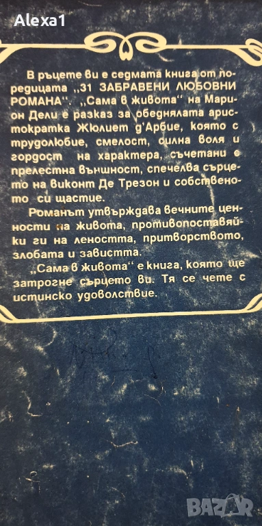 " Сама в живота " - Марион Дели,151 стр., меки корици, дефекти по кориците, скъсана страница на съдържанието.