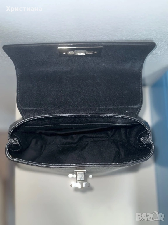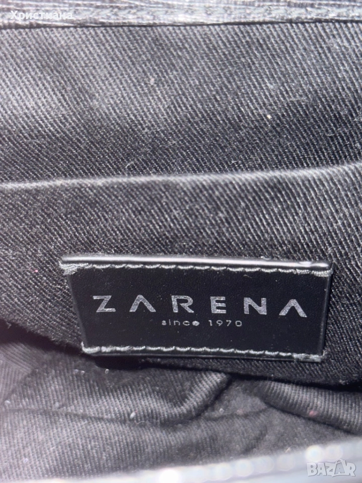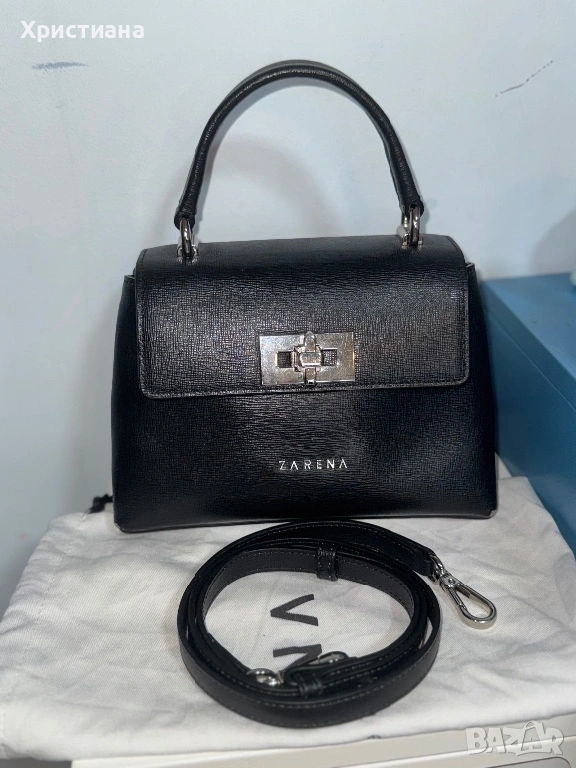 Черна чанта от естествена кожа на Зарена. Използвана. Съхранявана добре, има малки щети - много леко излющени долни ръбчета и малко драскотини по металната част на закопчалката. Всичко е показано на снимките.