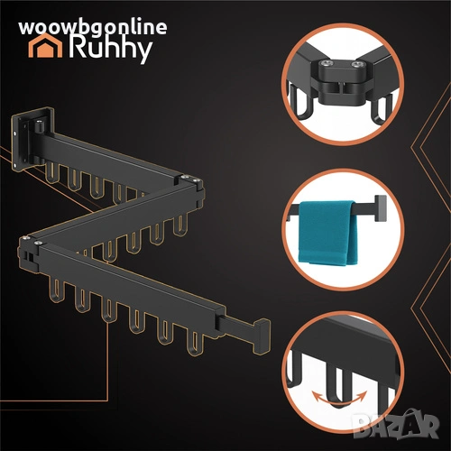 Сушилнята RUHHY комбинира сушилник и закачалка в едно, като разполага с 18 куки и въртящи се рамена, които могат да се настройват под различни ъгли за максимално удобство.