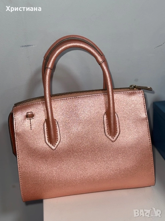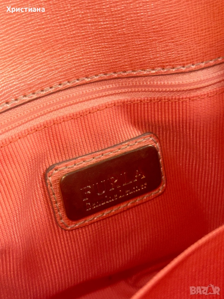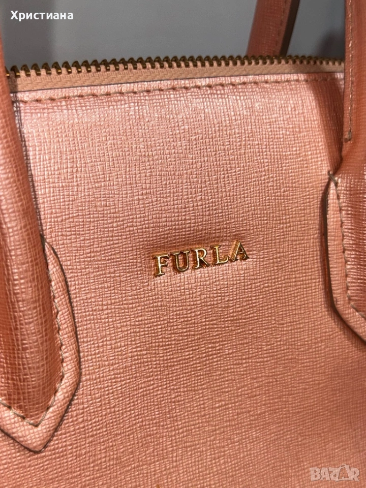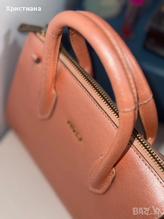 Чанта Furla, цвят сьомга. Носена веднъж, добре съхранявана. Чантата е по-стар модел, който вече не е наличен по онлайн или физическите магазини. Естествена кожа е, няма никакви щети по нея. Не пазя кутия/дъстбаг. Пазя дългата дръжка, с която идва.