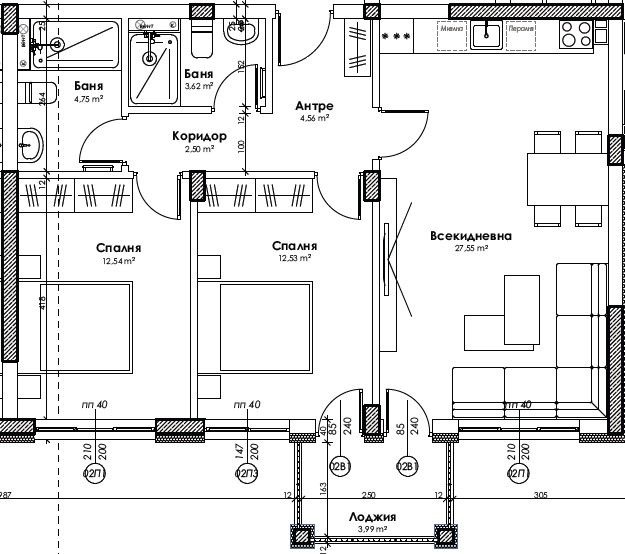 Апартаментът е ситуиран на 2-ри от 5-ти жилищен етаж и разполага с площ от 94 кв.м., разгърната по следния практичен начин: входно антре, всекидневна, две спални, две бани с тоалетни, лоджия.