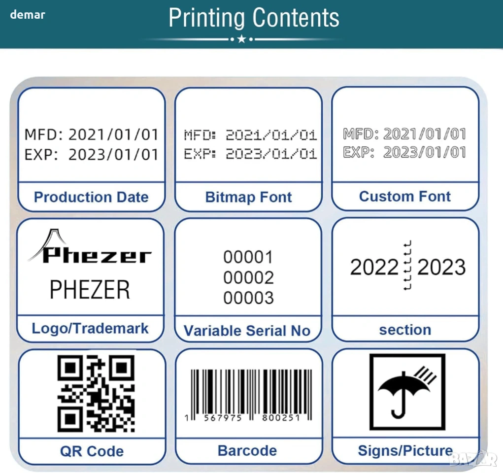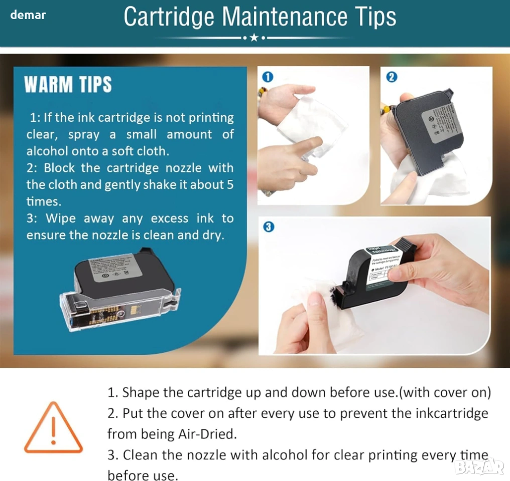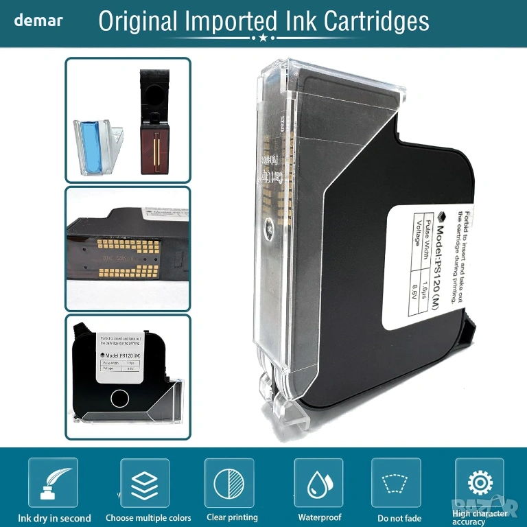 72 мл мастилен патрон с голям капацитет, способен да отпечата до приблизително 100 000 знака, проектиран за бърза и лесна подмяна без инструменти или технически умения. С бързосъхнещо, водоустойчиво мастило, подходящо за широк спектър от непорести и порести повърхности, включително хартия, картон, дърво, камък, плат, метал, стъкло и MDF. Осигурява гладък, постоянен печат със силно сцепление, ясни маркировки и намален риск от запушване на дюзите, като същевременно позволява лесна поддръжка чрез покриване на дюзата, когато не се използва, и избърсване, ако е необходимо.
