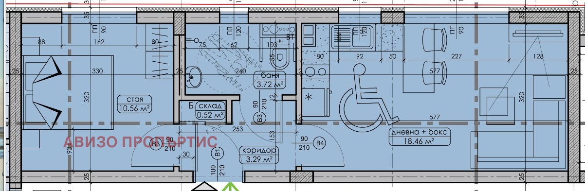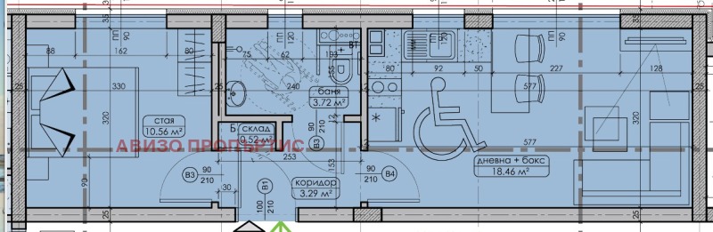 Апартамента се състои от входно антре, всекидневна с кухненски бокс, спалня, баня с тоалетна, складово помещение.
