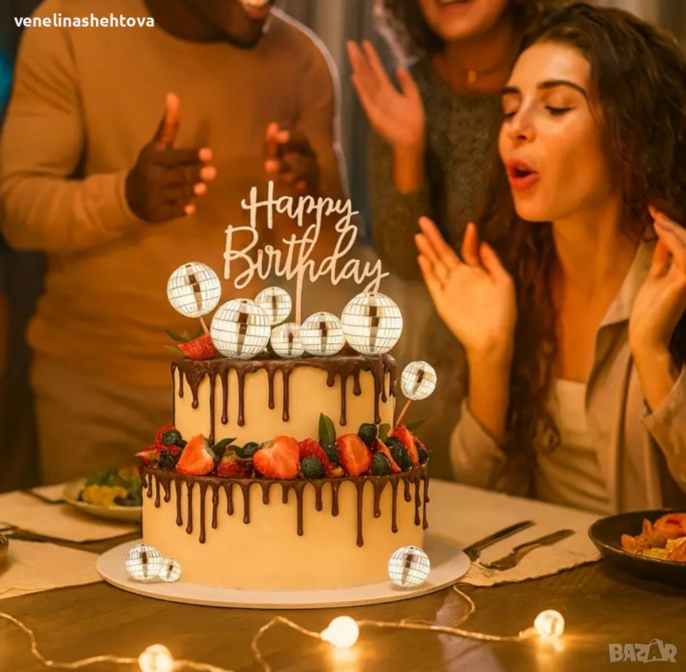 25 броя комплект огледални диско топки топчета на клечка топер Happy birthday декорация на торта → Обява 53384721