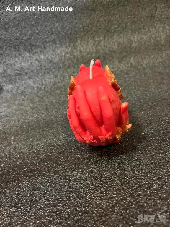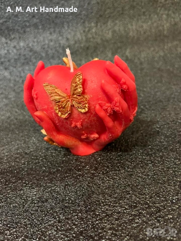 Тази ръчно изработена свещ преплита символите на вечната обич и новото начало. Композицията от длани, сърце и пеперуди създава усещане за нежност, грижа и магическа трансформация.
