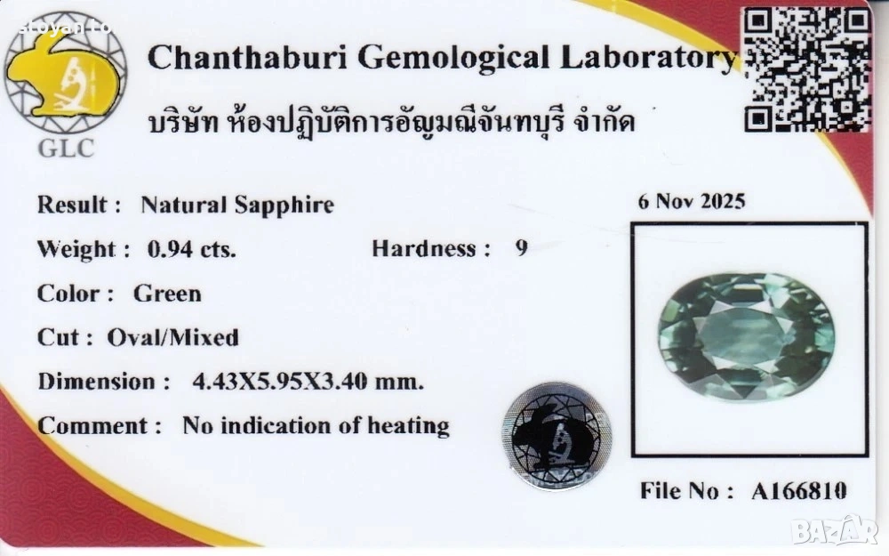 Естествен сапфир в искрящ зелен цвят 0.94кт.! Сертифициран! нов!