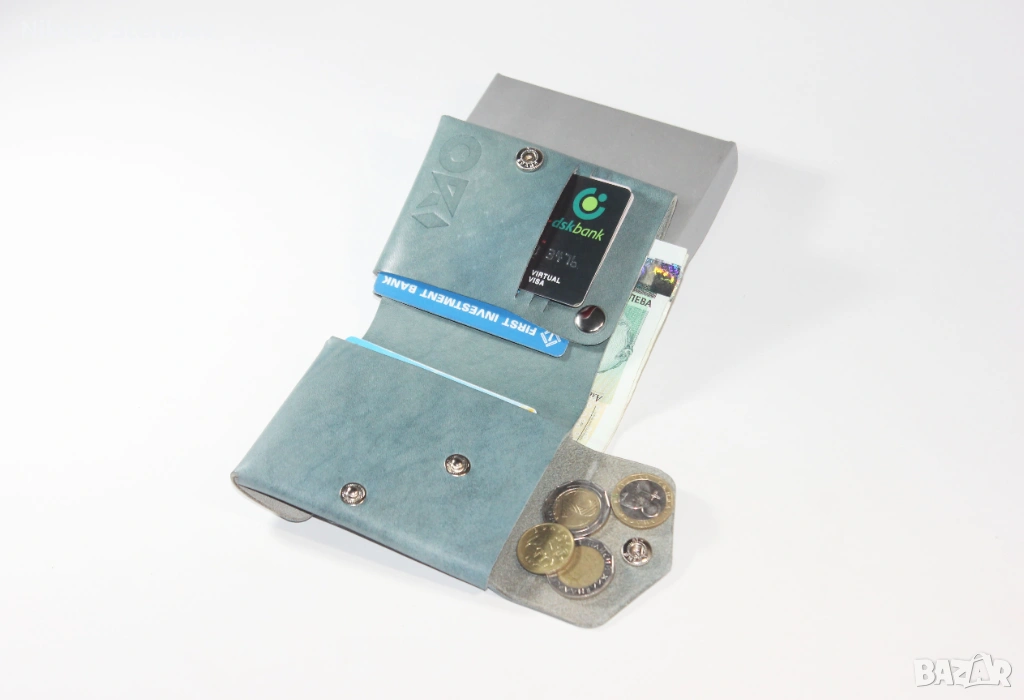 - Разполага с 3 слота за карти, които побират общо 6 карти, отделение за банкноти, голям монетник и 2 допълнителни отделения за карти и визитки