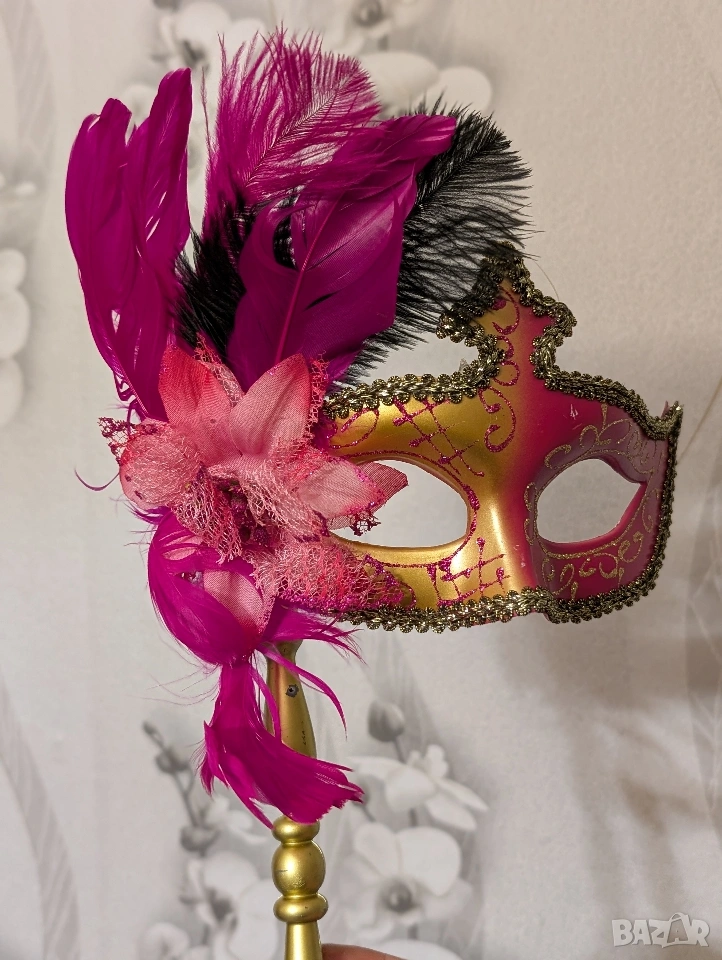 Красива маскарадна маска от пера на клечка. Класическият дизайн на маскарадна маска гарантирано ще привлече вниманието на всяко събитие, което планирате или посещавате!