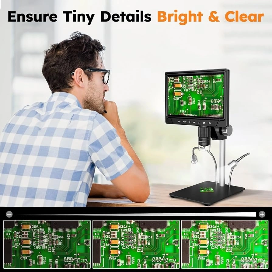 Дигиталният микроскоп BEBANG е високотехнологичен оптичен инструмент, проектиран да осигури прецизност и яснота при детайлна инспекция. Оборудван с голям 10.1-инчов HD IPS дисплей и 12MP сензор, устройството предоставя изключително качество на изображението, елиминирайки необходимостта от външен монитор или компютър при работа. Ергономичният дизайн с регулируем ъгъл на екрана до 90 градуса намалява напрежението във врата и очите по време на продължителна употреба. Този микроскоп е идеално решение за професионалисти и хоби ентусиасти, занимаващи се с ремонт на електроника (запояване), нумизматика (колекциониране на монети), бижутерия и образователни цели.