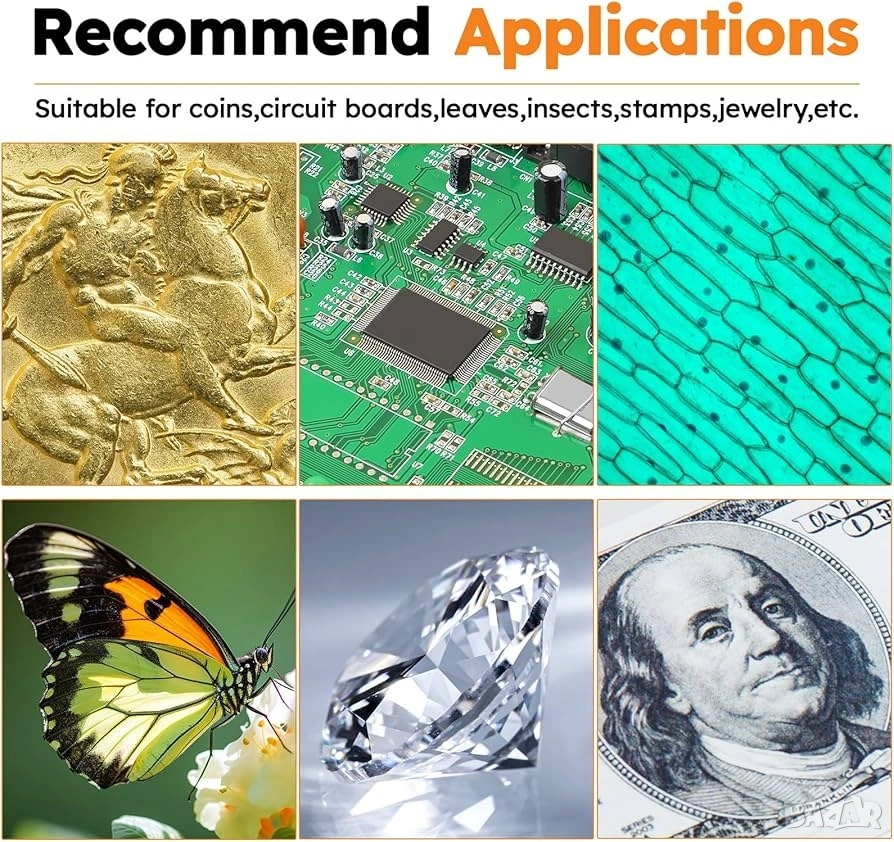 * Прецизно увеличение 50X-1200X: Позволява детайлно наблюдение на микроскопични обекти. Действителното увеличение варира в зависимост от разстоянието до обекта и размера на екрана.