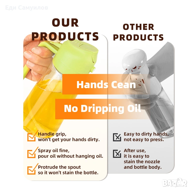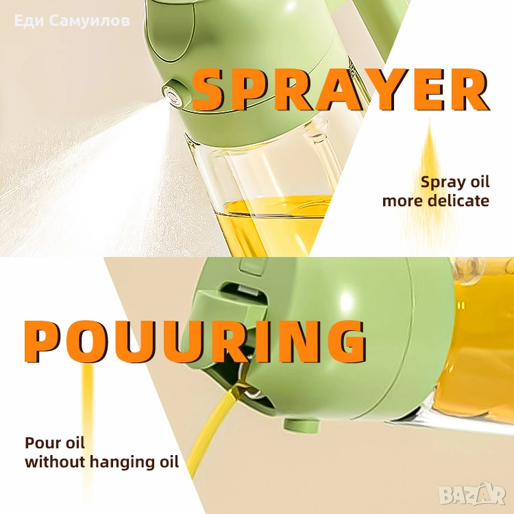 Модерен дизайн „2 в 1“: може както да се пръска (спрей), така и да се сипва контролирано – удобна за кухня, барбекю, салати, фритюрници и др.