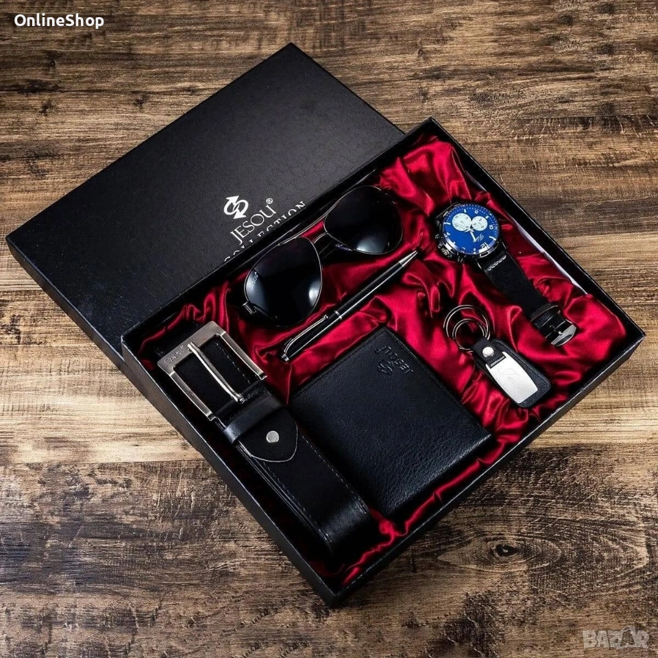 Съчетава се идеално както с официални тоалети и бизнес костюми, така и с ежедневни визии. Корпусът на часовника е изработен от неръждаема стомана, която е популярен материал за изработка на часовници поради своята издръжливост, а каишката е от еко кожа. Колан от еко кожа с класическа закопчалка. Класическите слънчеви очила са специално подбрани за всяка форма на лицето и със сигурност ще се харесат на всеки мъж. Ключодържателят може да се използва с ключове за кола, офис и дом. Писалка в семпъл стил ще изглежда впечатляващо на вашия работен плот.