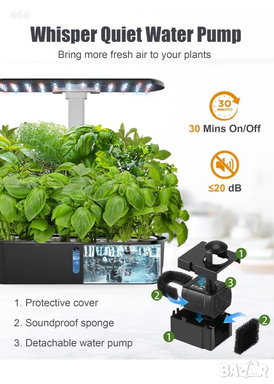 【Автоматична хидропонна система за вътрешна употреба】Тази интелигентна хидропонна градинарска система е с таймер за 16 часа включено и 8 часа изключено и е проектирана със система за циркулация на водата, увеличавайки кислорода във водата. Натиснете помпата, за да преминете в цикъл от 30 минути включено/30 минути изключено със супер нисък шум. Расте в хранителната вода 5 пъти по-бързо от почвата.