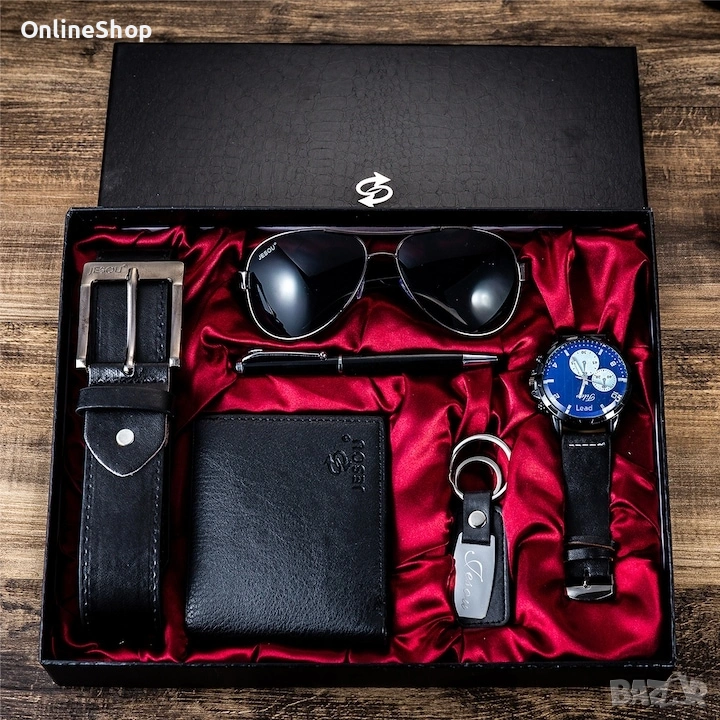 Мъжки подаръчен комплект от 6 части в кутия: портмоне, часовник, колан, очила, химикал, ключодържател.
