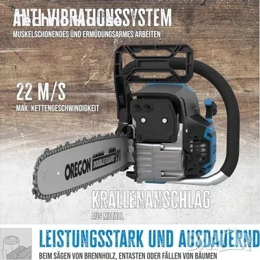 Трионът Gude 450-55 разполага с режещо острие и верига с качество Oregon, като дължината на рязане е 42 сантиметра.