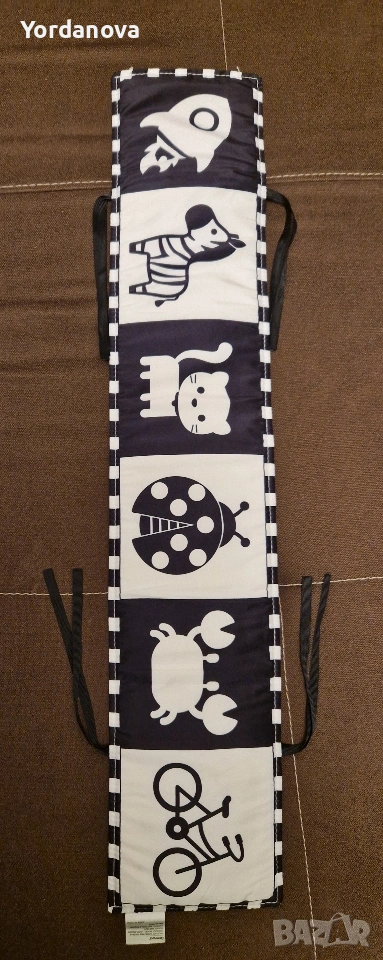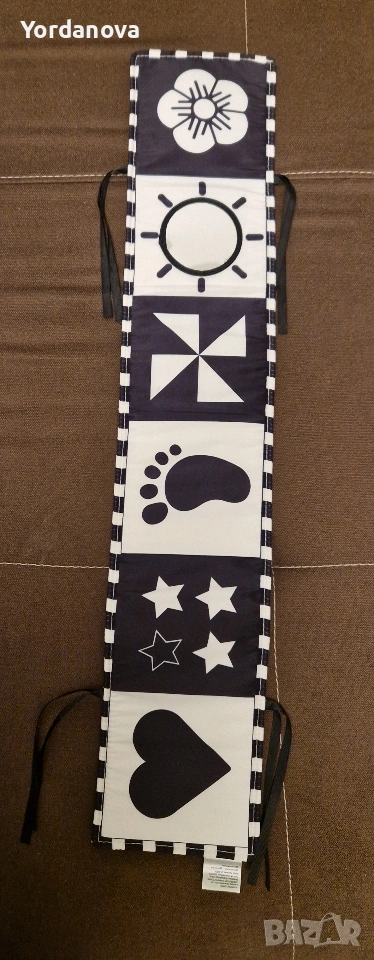 Мека книжка с висок контраст (черно-бяло) на изображенията. Предназначена е да стимулира зрителното развитие на новородени и малки бебета. Двустранен дизайн - включва 12 различни изображения, включително и огледалце. Може да се използва по време на игра по коремче (tummy time), да се закача на креватче, количка или столче за кола чрез приложените връзки. Използвана е броени пъти, в отлично състояние, без следи от употреба.