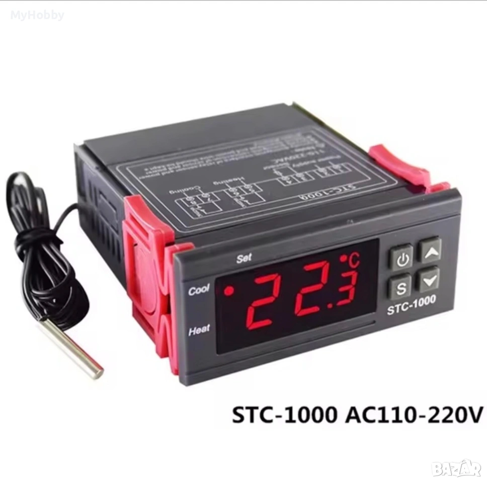 Терморегулатор STC1000 ТЕРМОСТАТ ЗА ИНКУБАТОР ОТОПЛИТЕЛНИ ИНСТАЛАЦИИ ОТ -50 ДО +99C 220V AC Термостат STC-1000, 230VAC, -50°C – 99°C Цифров терморегулатор, програмируем контролер за управление и контрол на температурата в диапазона от -50°C – 99°C. Терморегулатора може да се използва при работа на помпи за централно отопление, циркулационни помпи, вентилатори, инкубатори, оранжерии, промишлено оборудване и много подобни устройства. Контролера има 2 релейни изхода (10A всеки) за отопление и охлаждане. Термостата е с възможност за превключване между два режима: на охлаждане и отопление. Основни функции: Режим на отопление - в този режим релето е включено, докато температурата се повиши до зададената стойност Режим на охлаждане - в този режим релето е включено, докато температурата спадне до зададената стойност. Задаване на температурна разлика на задействане на релето. Калибриране на температурата. Закъснение на компресора. Задаване на алармена температура Голям и лесен за четене LCD дисплей. Спецификации: Модел: STC-1000 Захранване: AC 220V Температурен диапазон: -50°C – 99°C Точност при измерване на температурата/влажността: +/-1°C Разделителна способност на измерване: 0,1°C Измервателна сонда: NTC сензор Тип изход: Релеен изход - двоен Изходен ток: 10A MAX Максимална мощност: 2500W Дължина на кабела на сондата: 1 метър Консумирана мощност: Температура на съхранение: -30°C - 75°C Външни размери: 75 x 34 x 85 мм Монтажен отвор: 70 х 27 мм