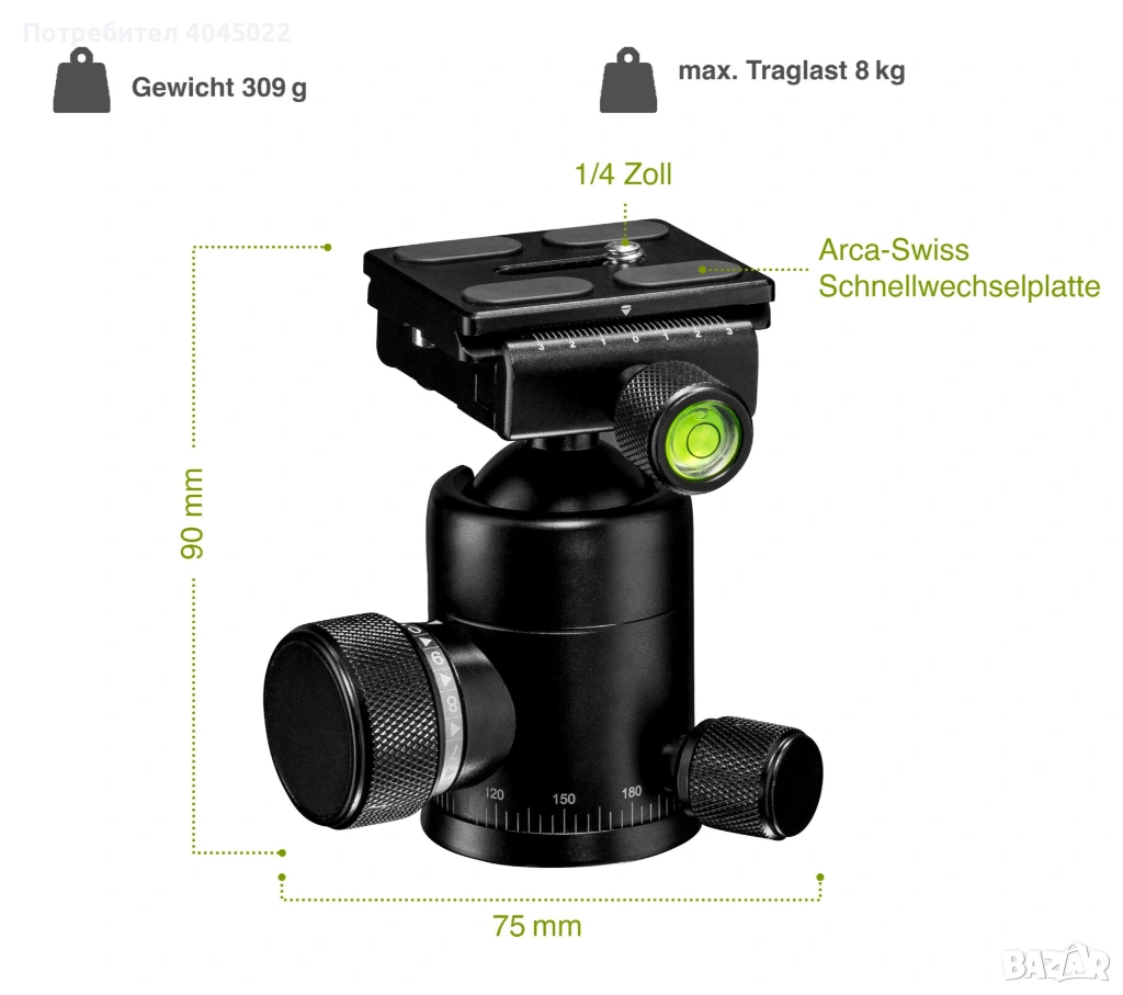 Ябълковидна глава с Arca quck-release плочка → Обява 53387495