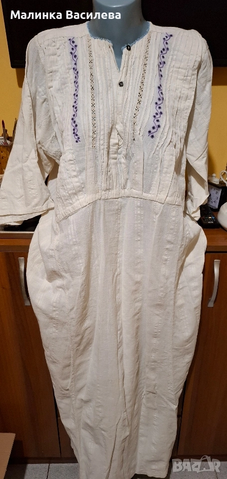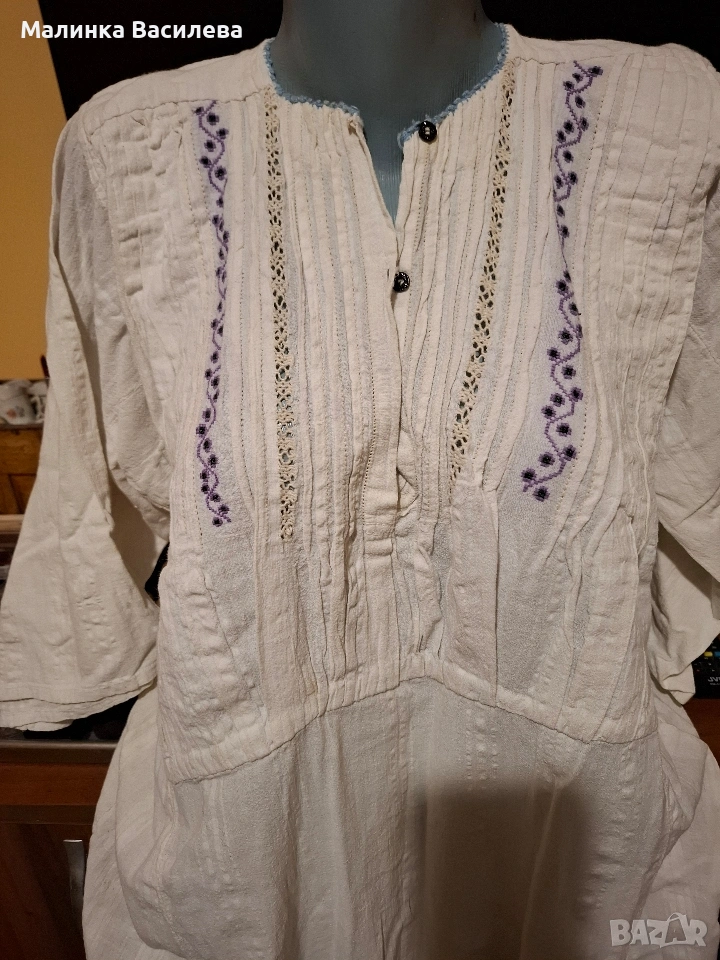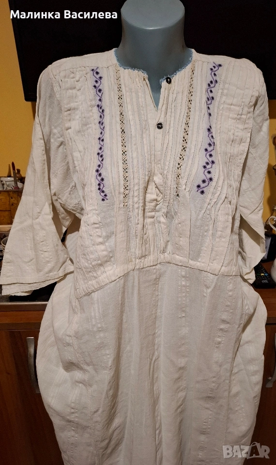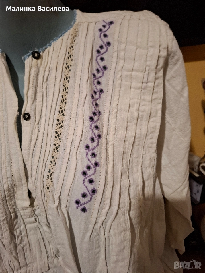 Продавам автентична кенарена риза от естествен памук, с фина ръчна бродерия в лилави тонове и декоративна дантела. Красива традиционна изработка с характерни вертикални набори и копчета отпред.