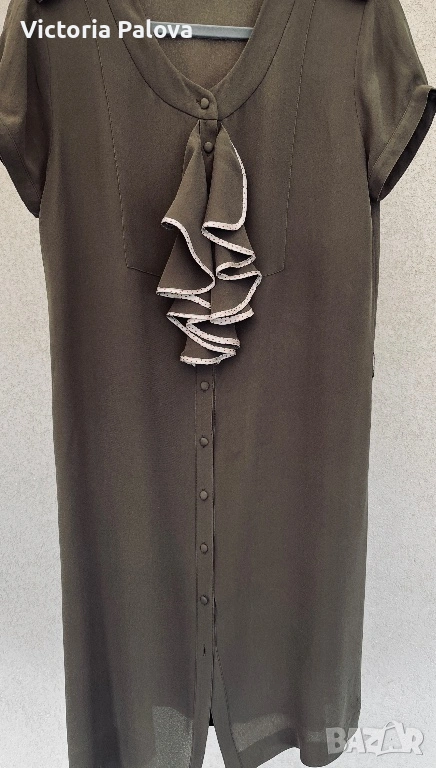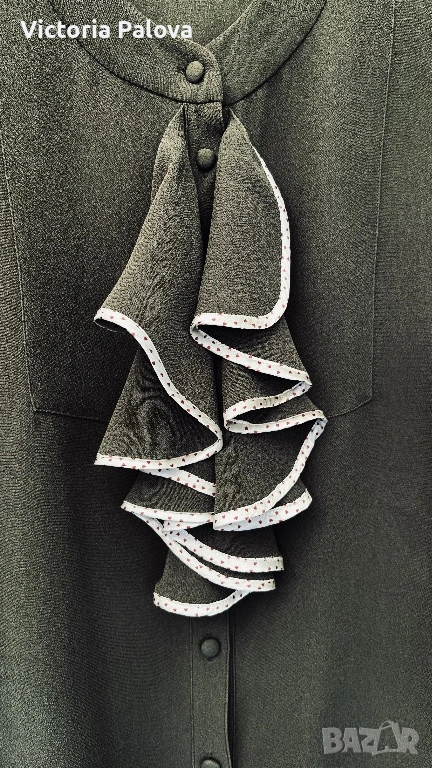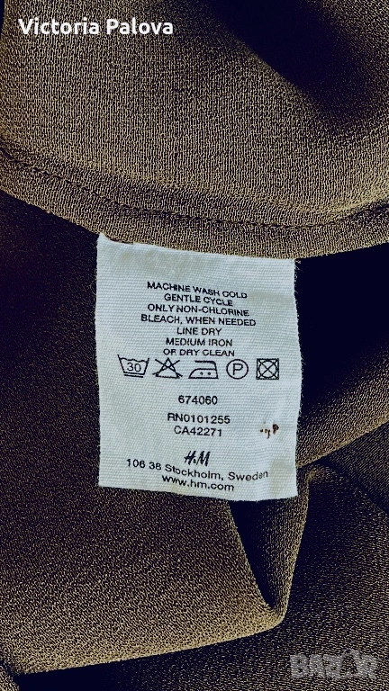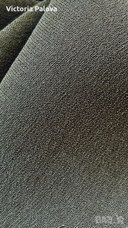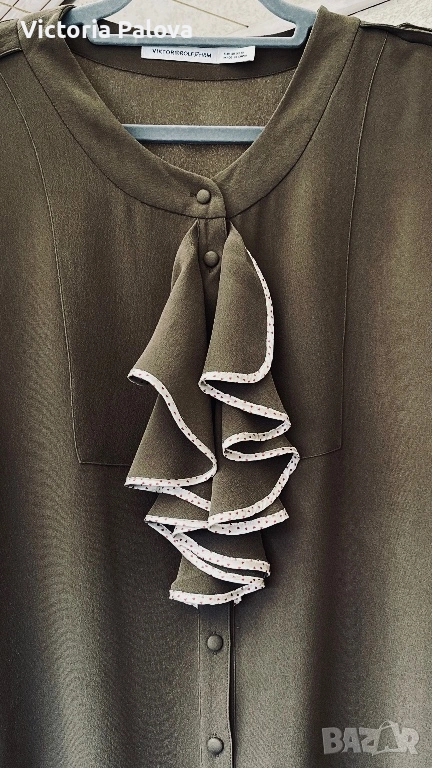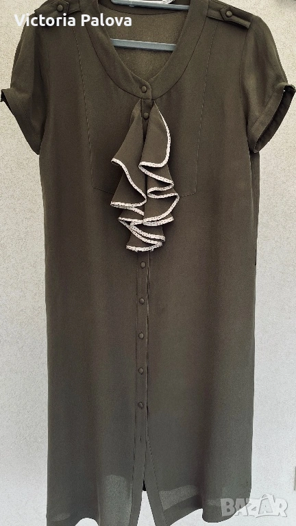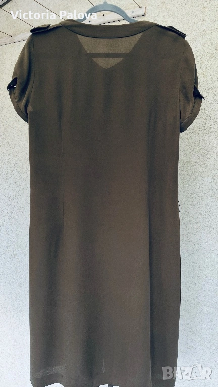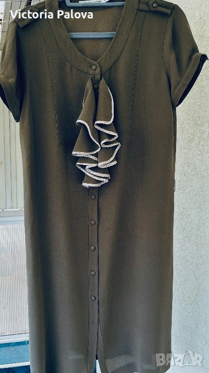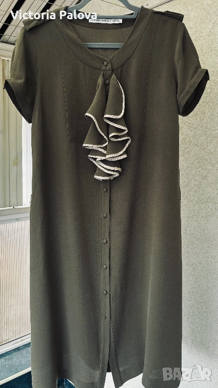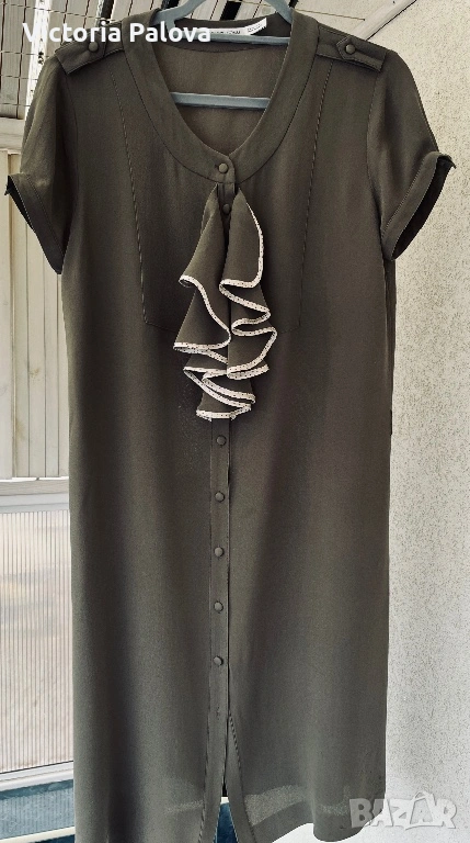 Уникална маслиненозелена рокля от колаборация VIKTOR & ROLF с H&M - истинска колекционерска перла, която съчетава лукс и достъпност. 100% чиста коприна в креп , с лека зърнеста текстура с меко матово усещане , което добавя изтънченост и създава изискан силует. В дълбок маслиненозелен нюанс , с копчета отпред и къси ръкави с маншети, роклята е акцентирана от асиметричен волан с бял пунктиран кант на гърдите - детайл, който добавя романтичен и игрив чар, вдъхновен от иконичните дизайни на VIKTOR & ROLF. Роклята е дизайнерска магия с история, може да се комбинира с колан, с обувки на ток или минималистични аксесоари. Рамо - 43см, ГО - 53см, талия - 50см, ханш - 56см, дължина - 102см.